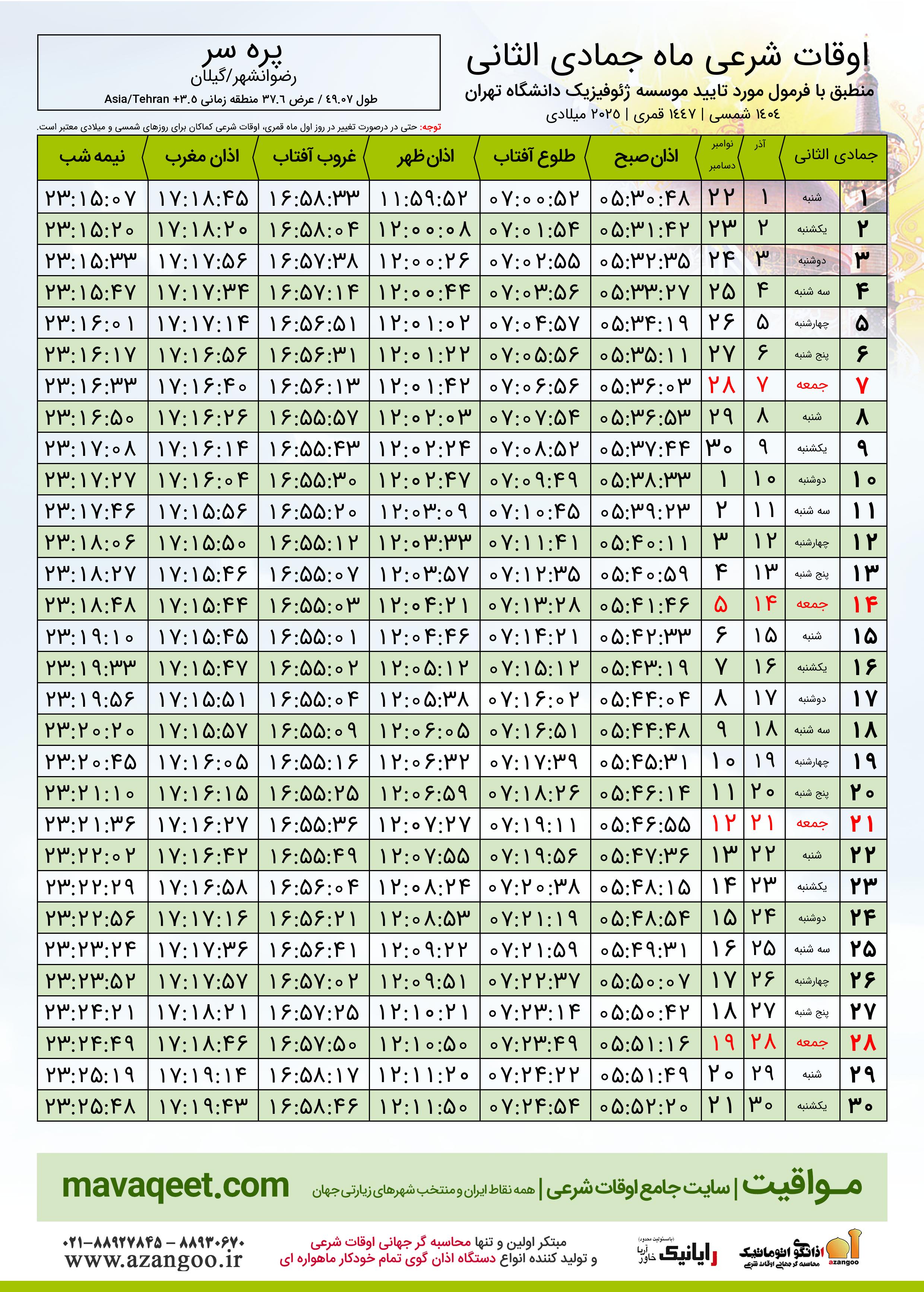 اوقات شرعی ماه رجب ١٤٤٧ هـ.ق شهر پره سر بر