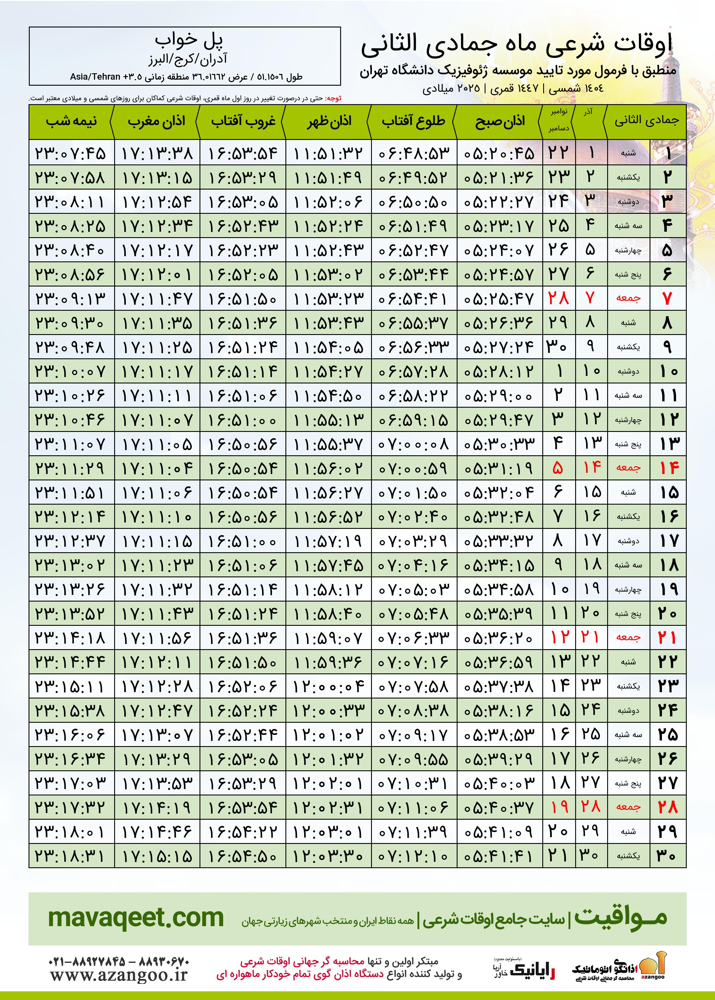 جدول اوقات شرعی جمادی الثانی ١٤٤٧ قمری روستای پل خواب
