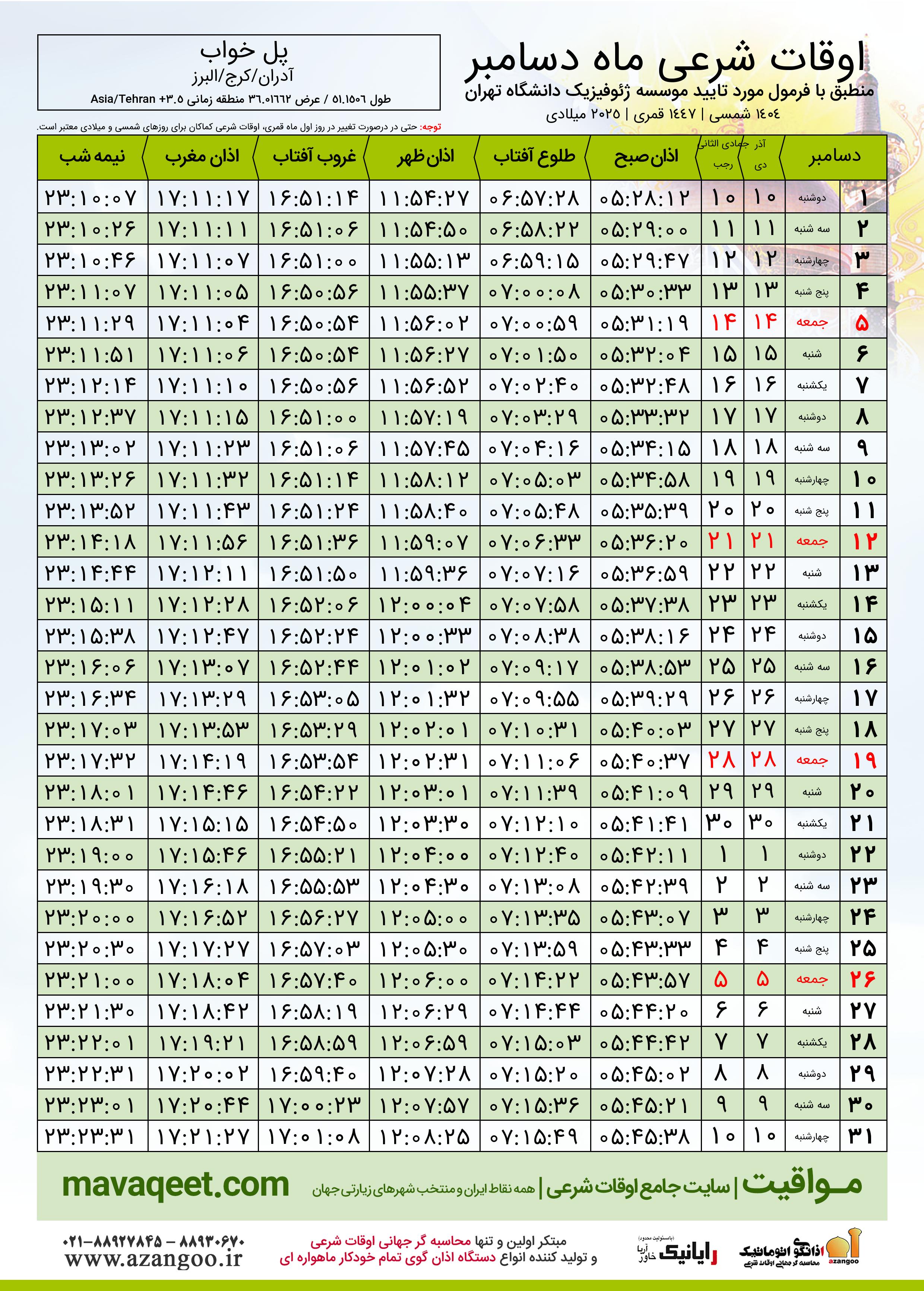 جدول اوقات شرعی دسامبر ٢٠٢٥ میلادی روستای پل خواب