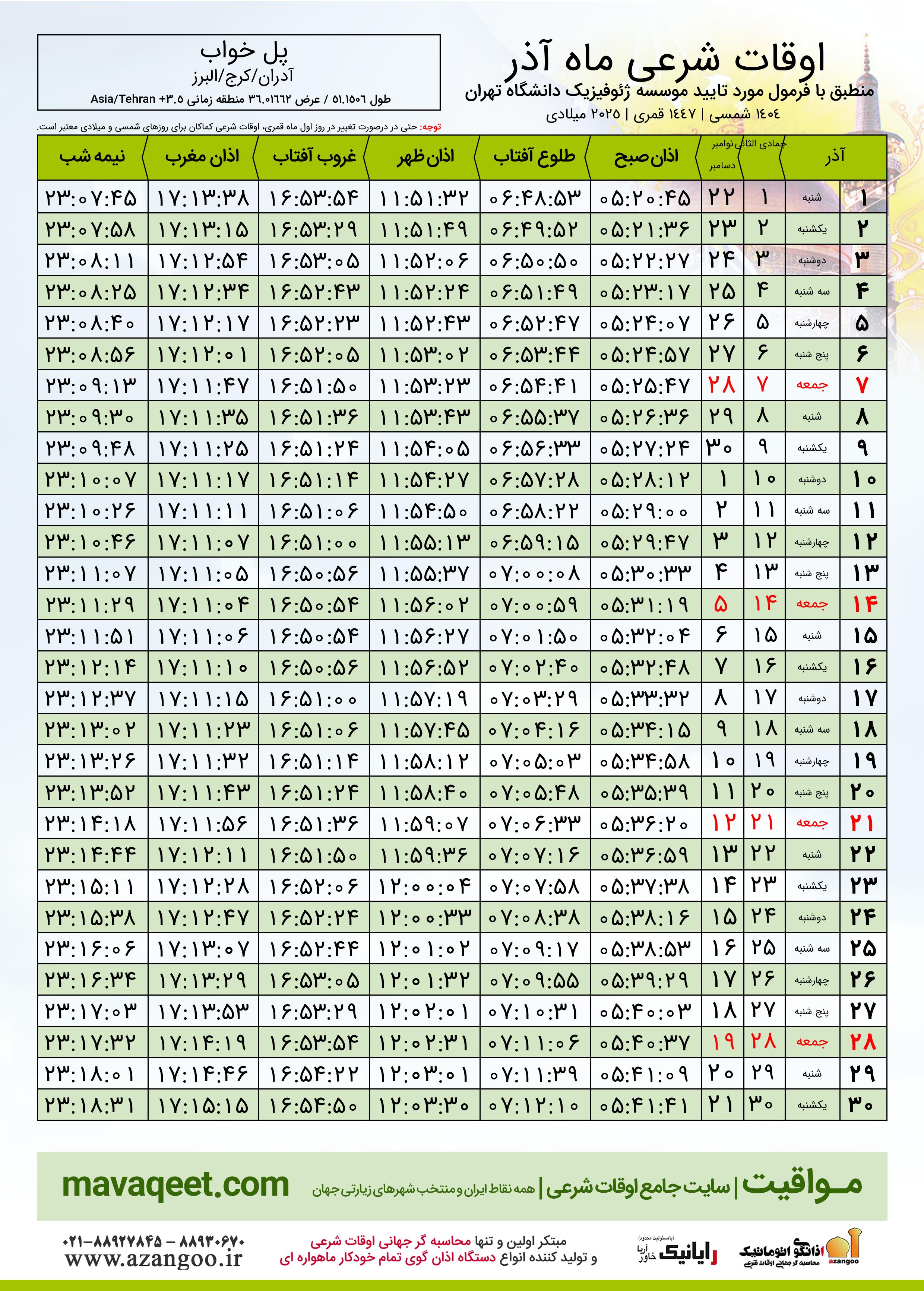 جدول اوقات شرعی آذر ١٤٠٤ شمسی روستای پل خواب
