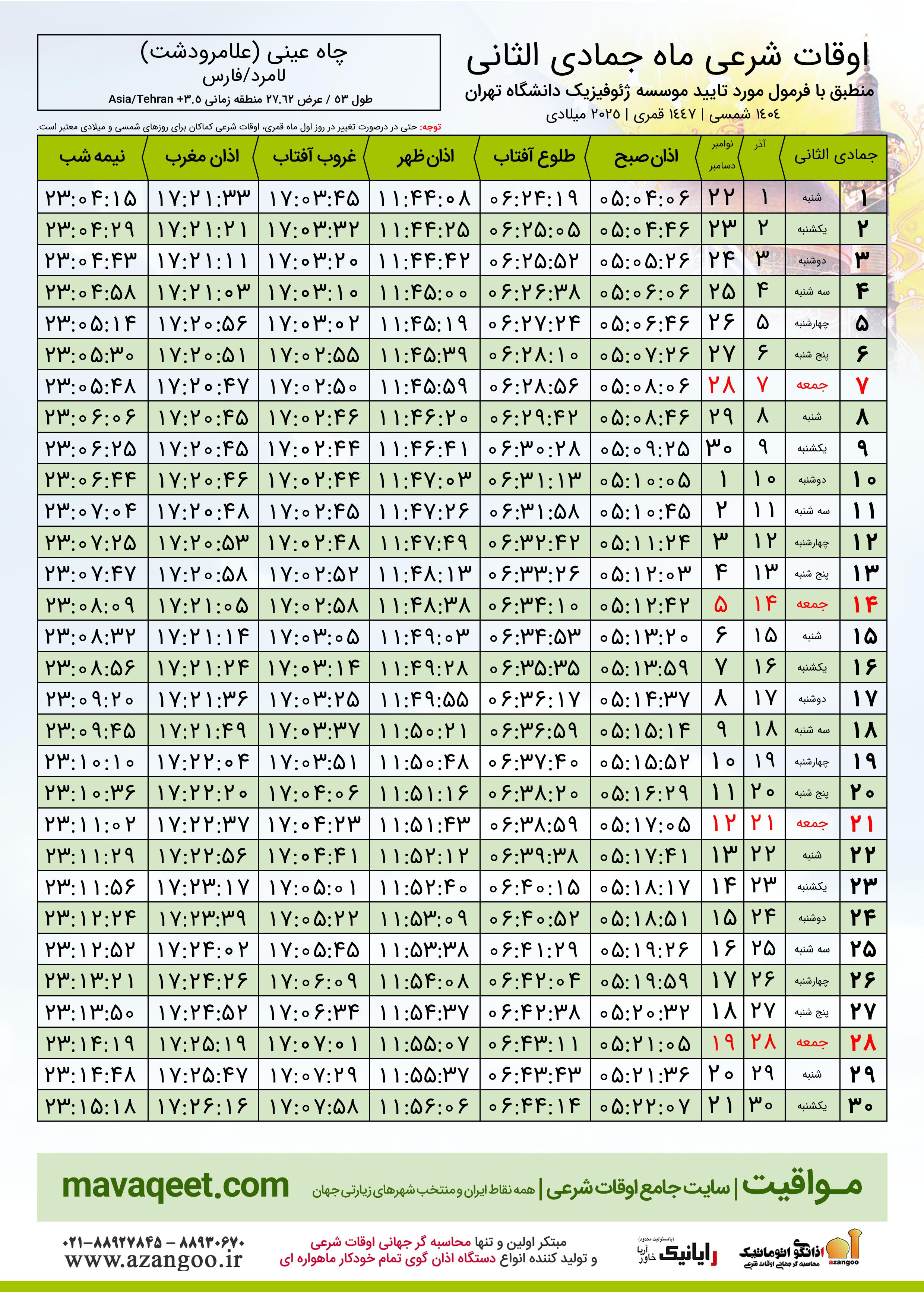 دانلود اوقات شرعی ماه رمضان ٠٤ - ١٤٠٤ شمسی | ٢٠٢٦ میلادی | ١٤٤٧ قمری شهر چاه عینی (علامرودشت)