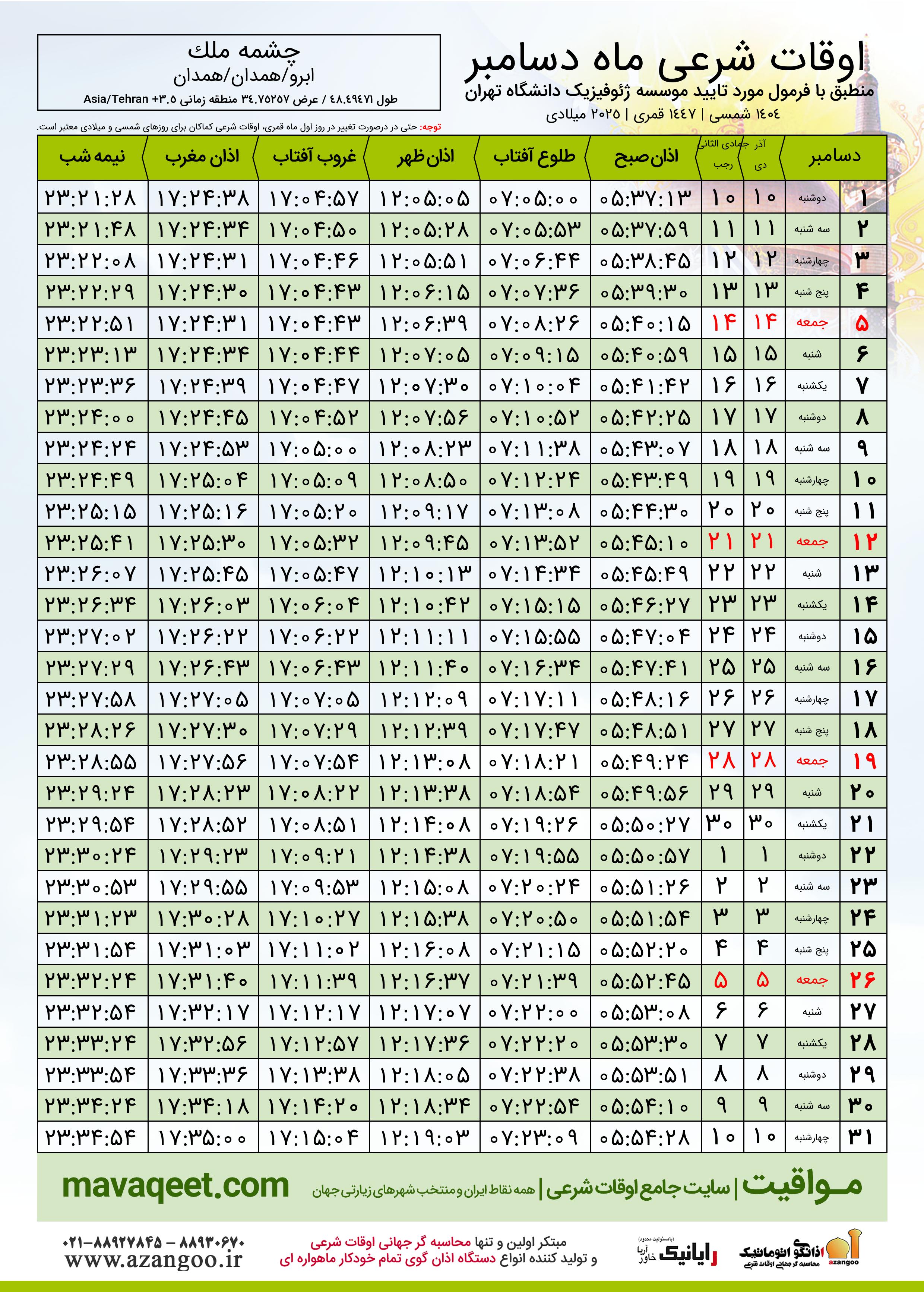 جهت نمایش تصویر جدول اوقات شرعی جدول اوقات شرعی دسامبر ٢٠٢٥ میلادی روستای چشمه ملک روستای چشمه ملک در اندازه