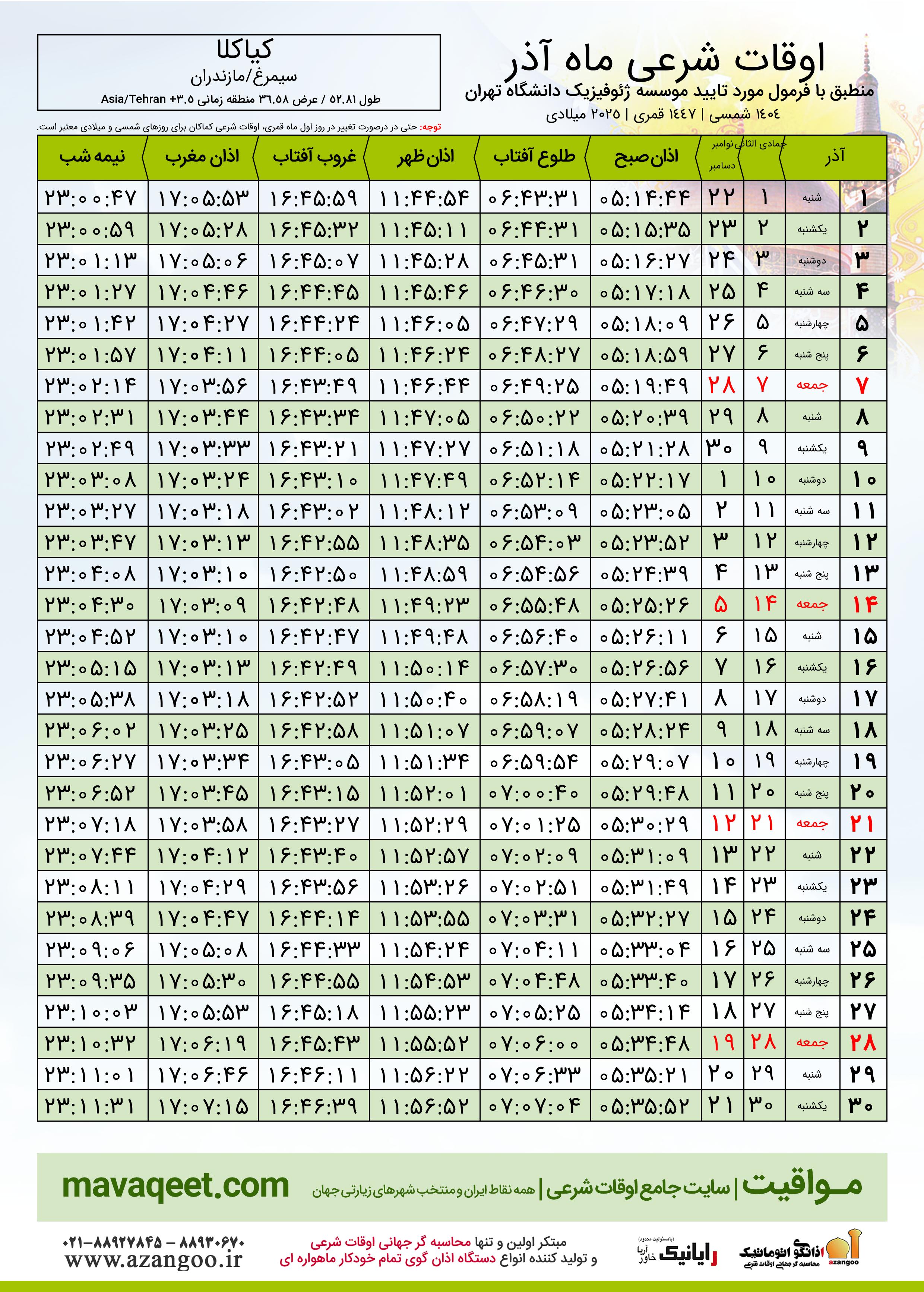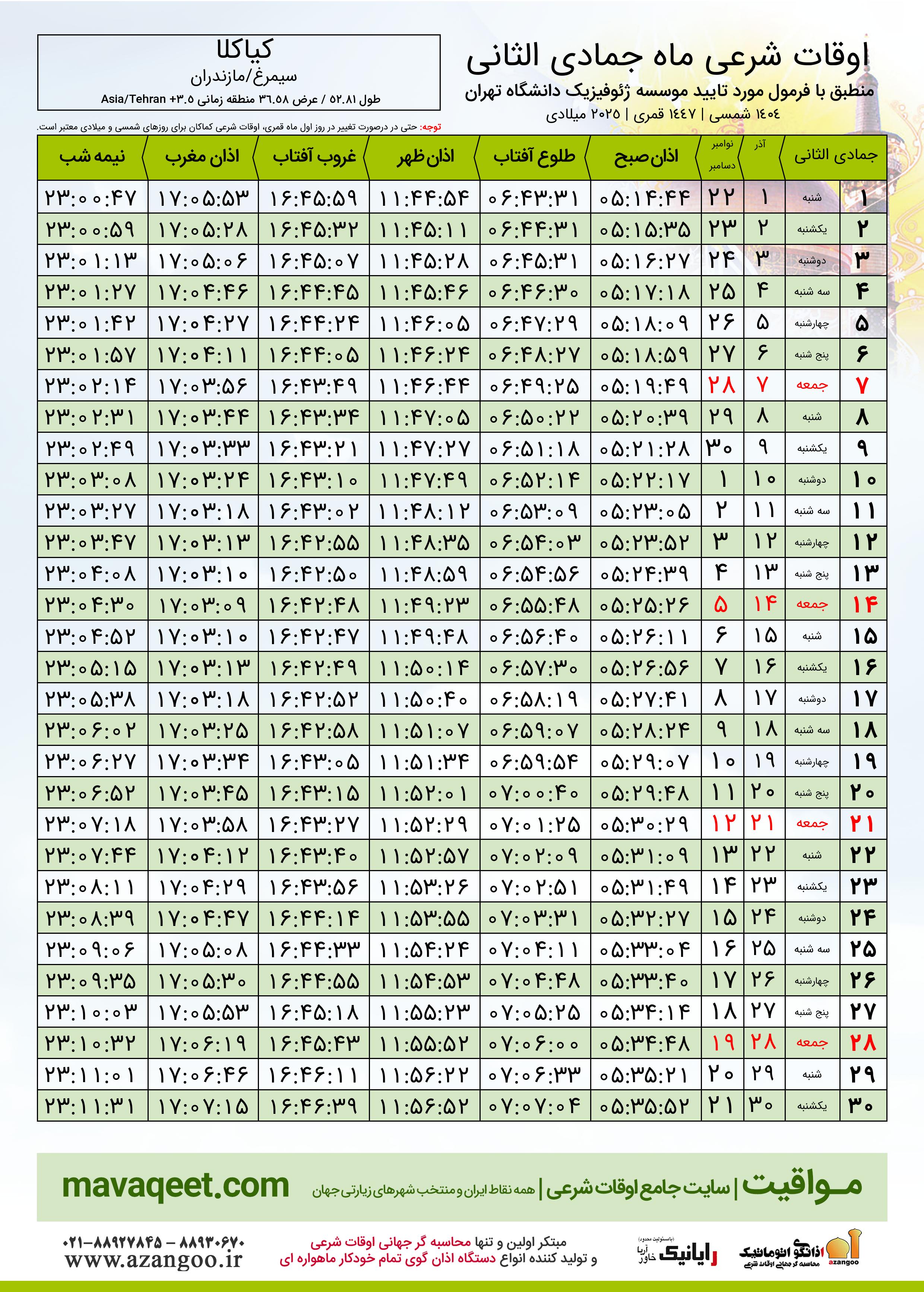 دانلود اوقات شرعی ماه رمضان ٠٤ - ١٤٠٤ شمسی | ٢٠٢٦ میلادی | ١٤٤٧ قمری شهر کیاکلا