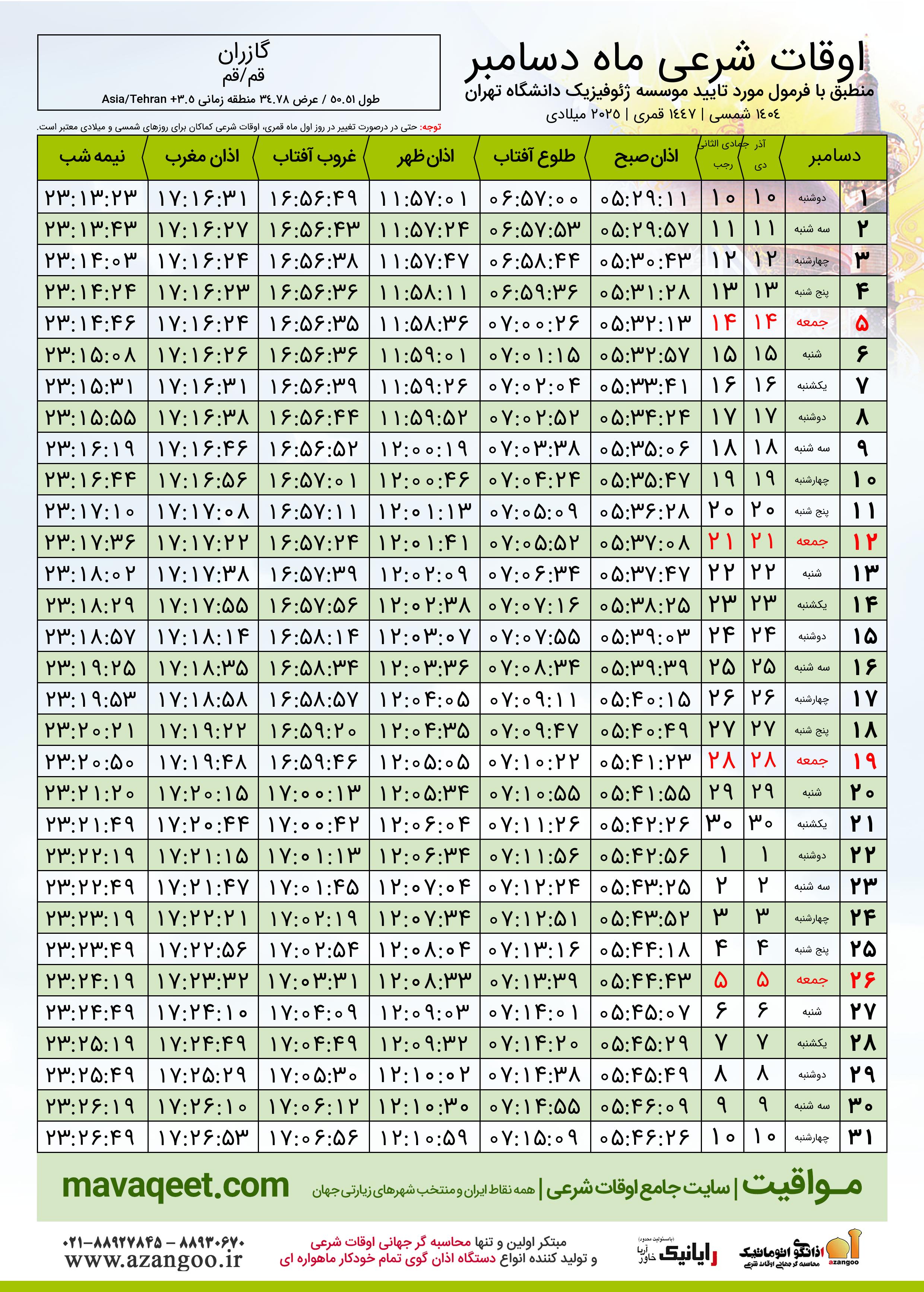 جدول اوقات شرعی دسامبر ٢٠٢٥ میلادی شهر گازران