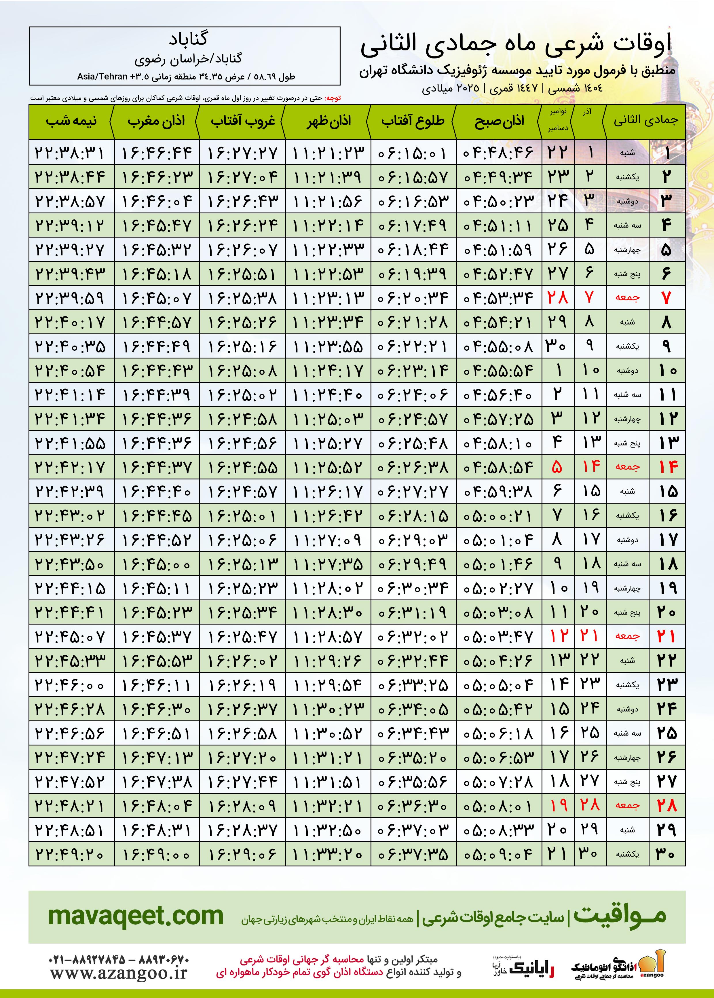 اوقات شرعی ماه جمادی الثانی ١٤٤٧ هـ.ق شهر گناباد بر