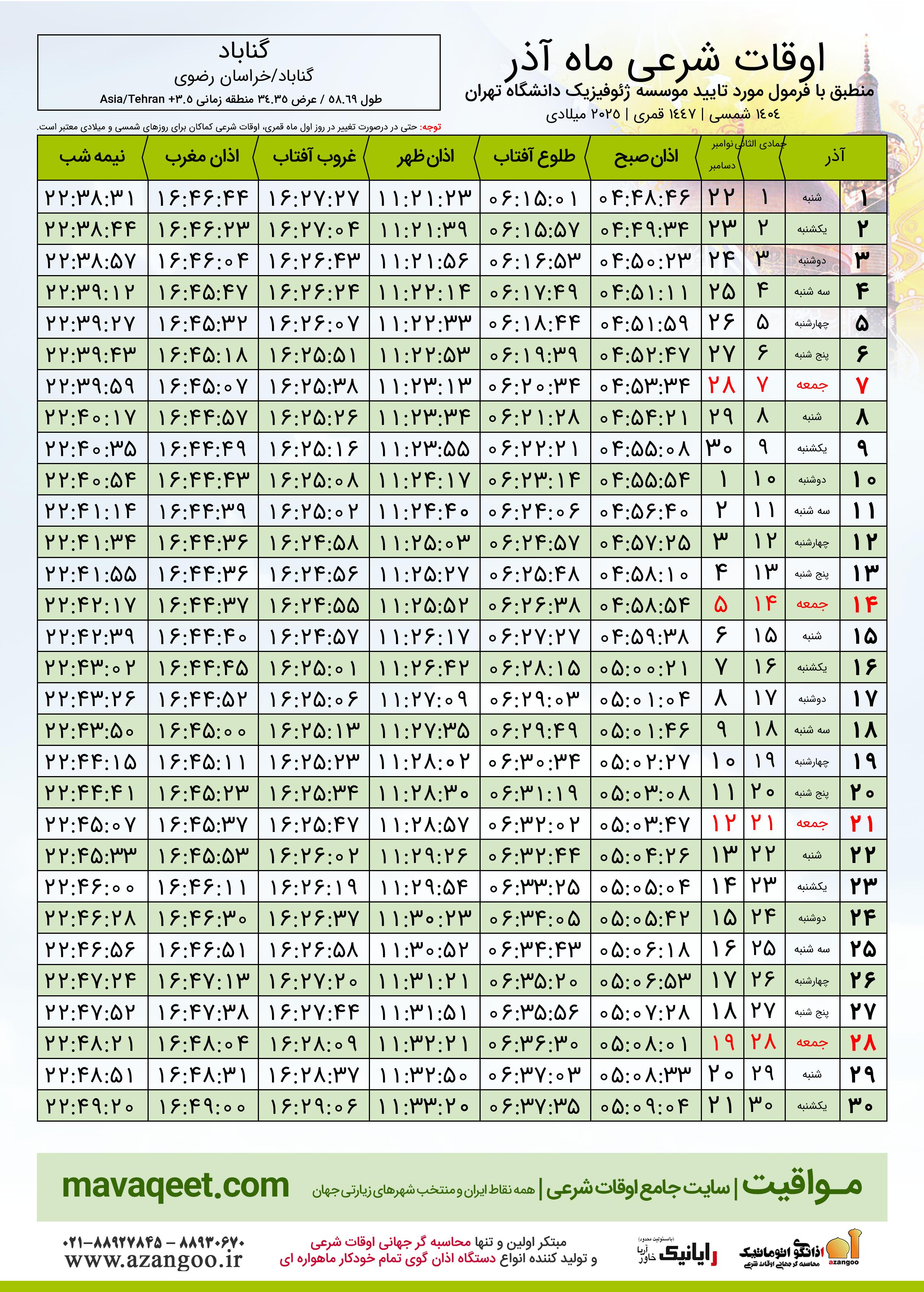 جدول اوقات شرعی آذر ١٤٠٤ شمسی شهر گناباد