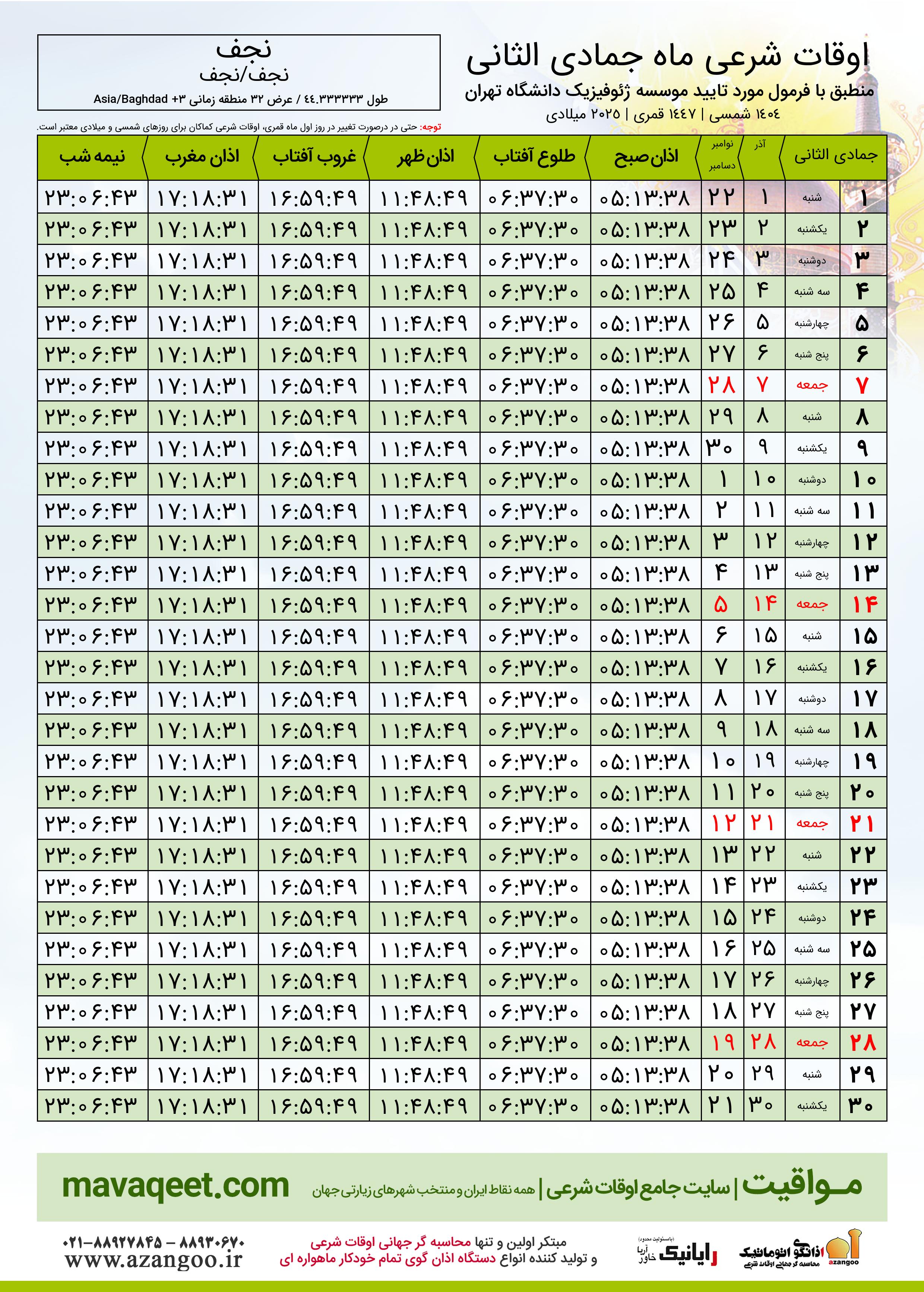 جدول اوقات شرعی جمادی الثانی ١٤٤٧ قمری شهر نجف