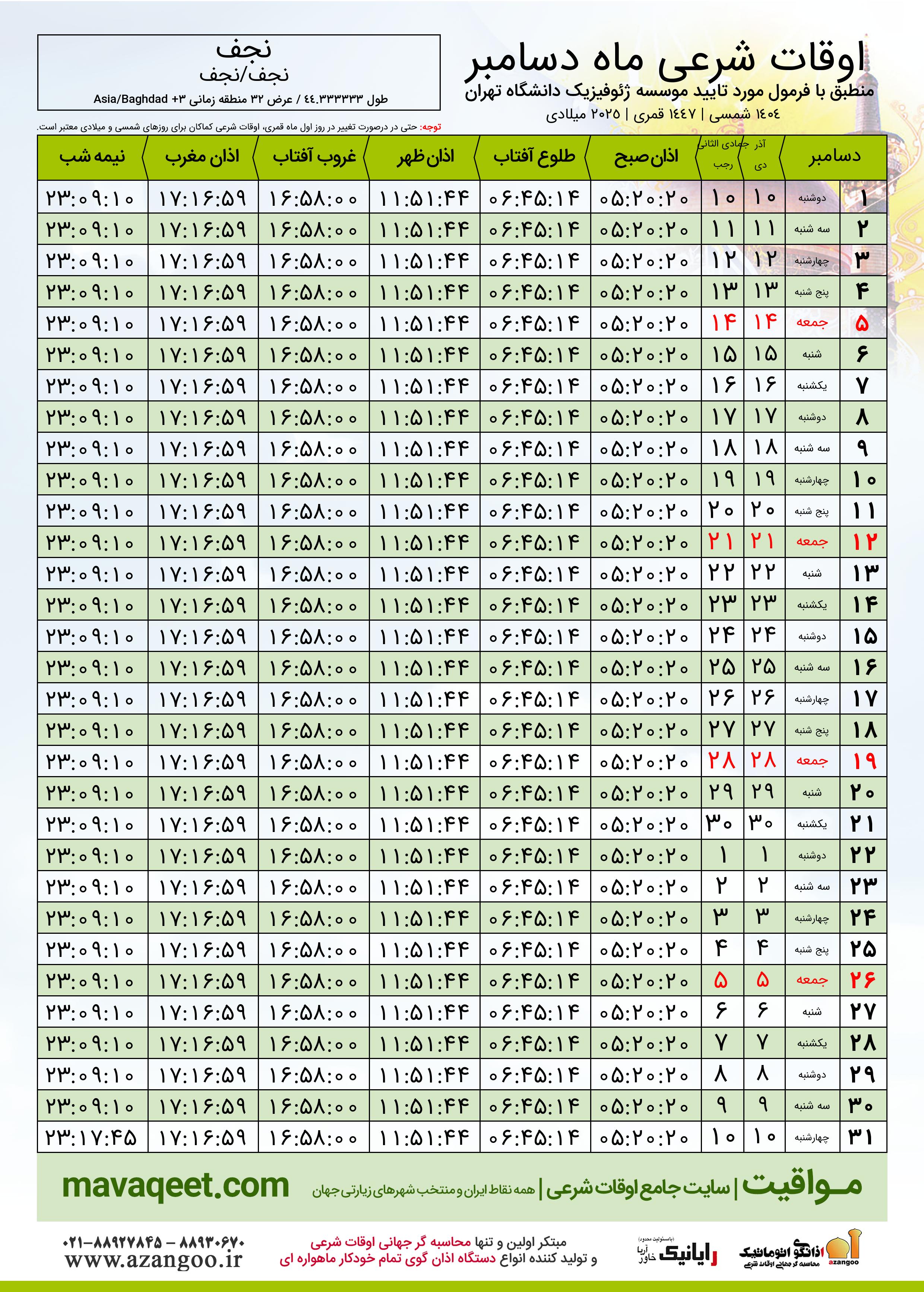 جدول اوقات شرعی دسامبر ٢٠٢٥ میلادی شهر نجف