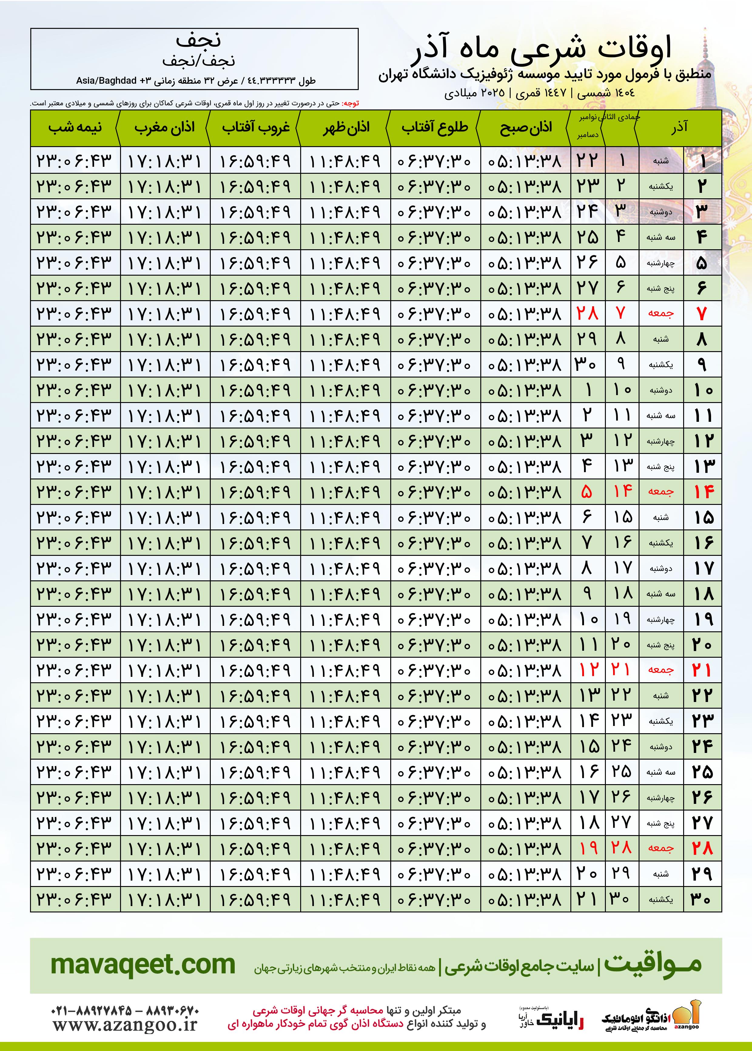 جدول اوقات شرعی آذر ١٤٠٤ شمسی شهر نجف