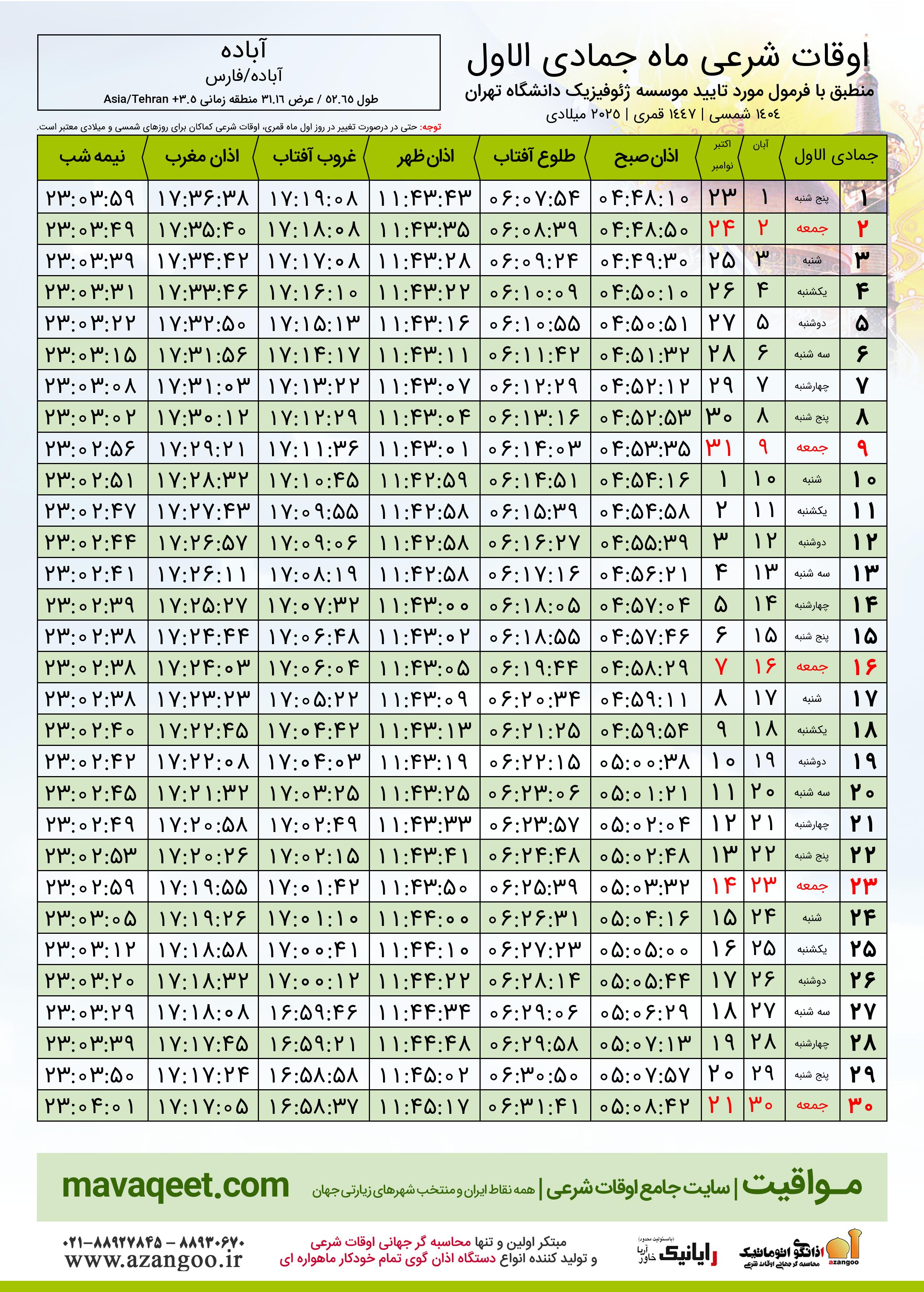 اوقات شرعی ماه جمادی الاول ١٤٤٧ هـ.ق شهر آباده بر