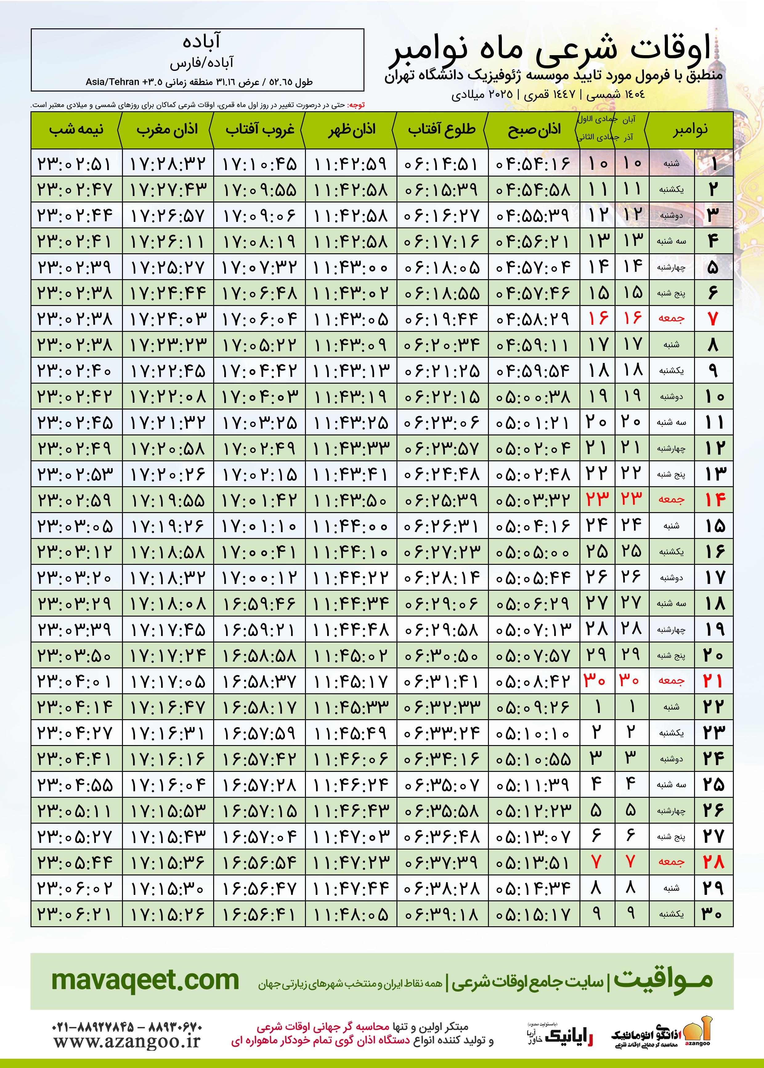 جدول اوقات شرعی نوامبر ٢٠٢٥ میلادی شهر آباده