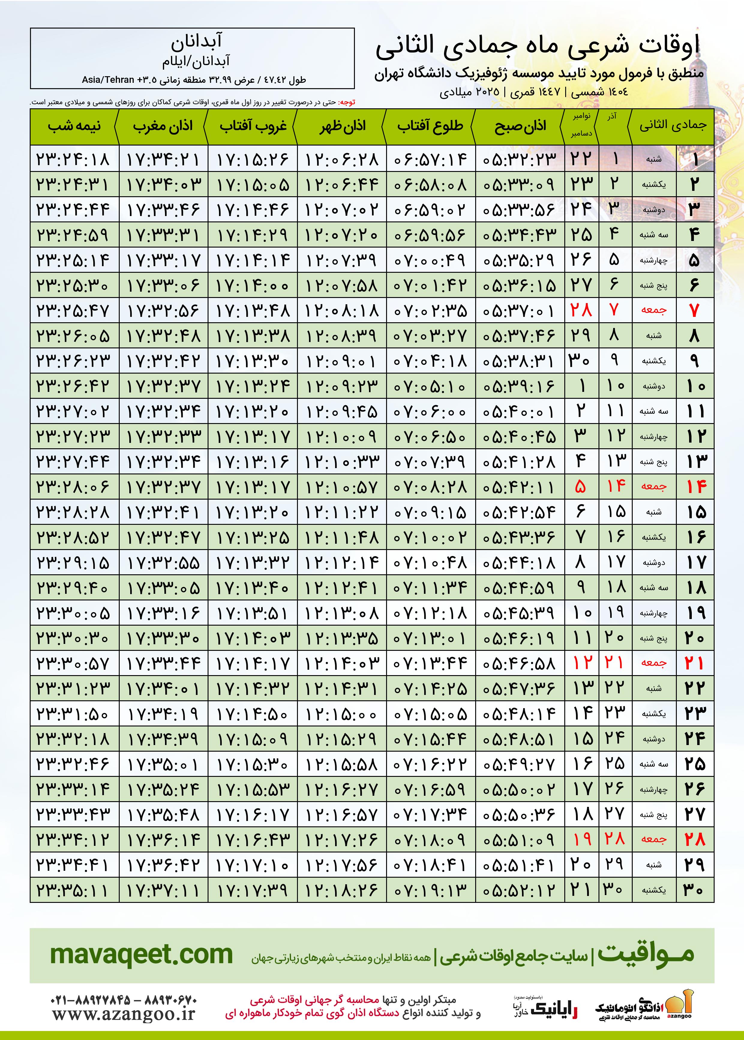 جدول اوقات شرعی جمادی الثانی ١٤٤٧ قمری شهر آبدانان