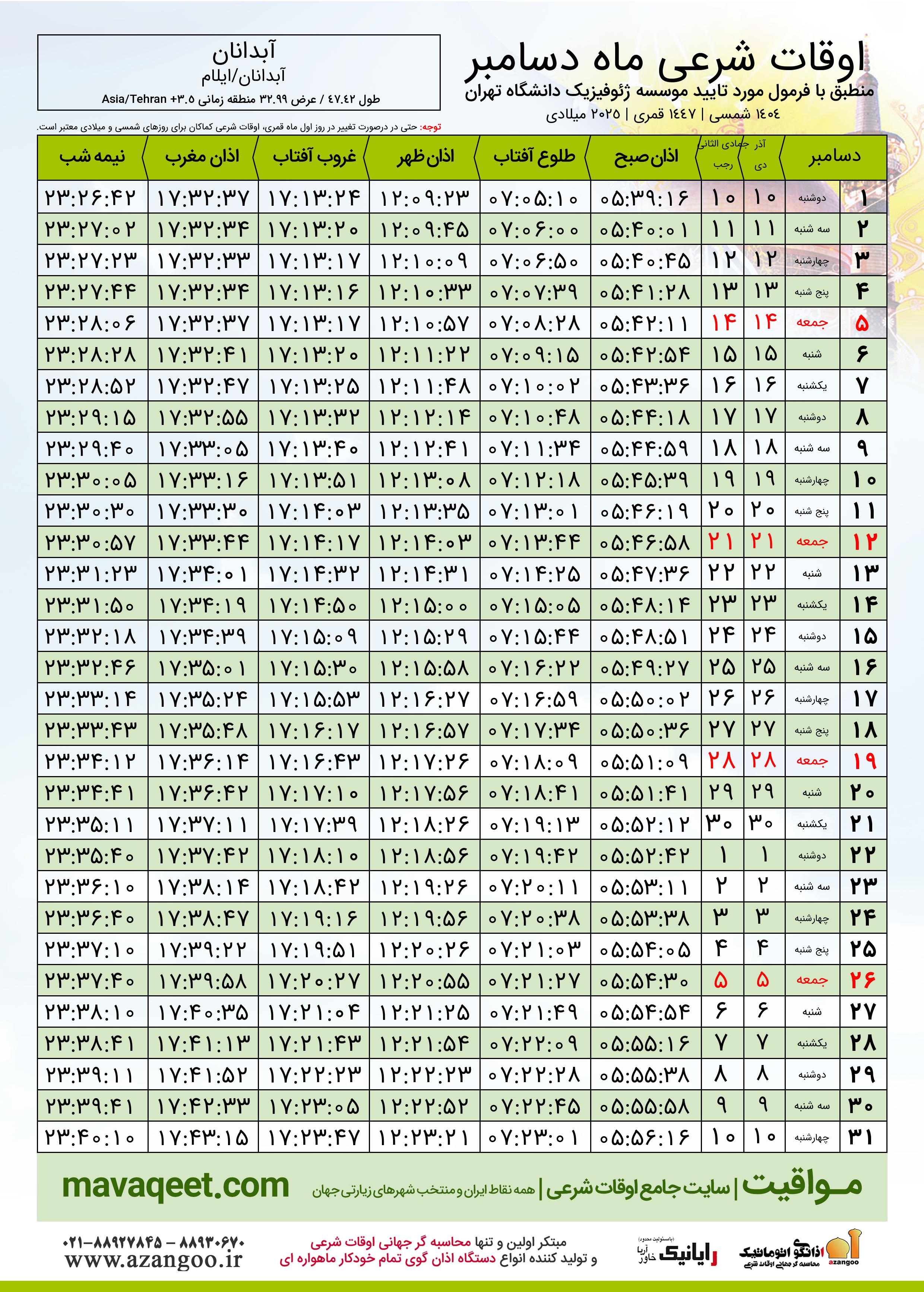 جدول اوقات شرعی دسامبر ٢٠٢٥ میلادی شهر آبدانان