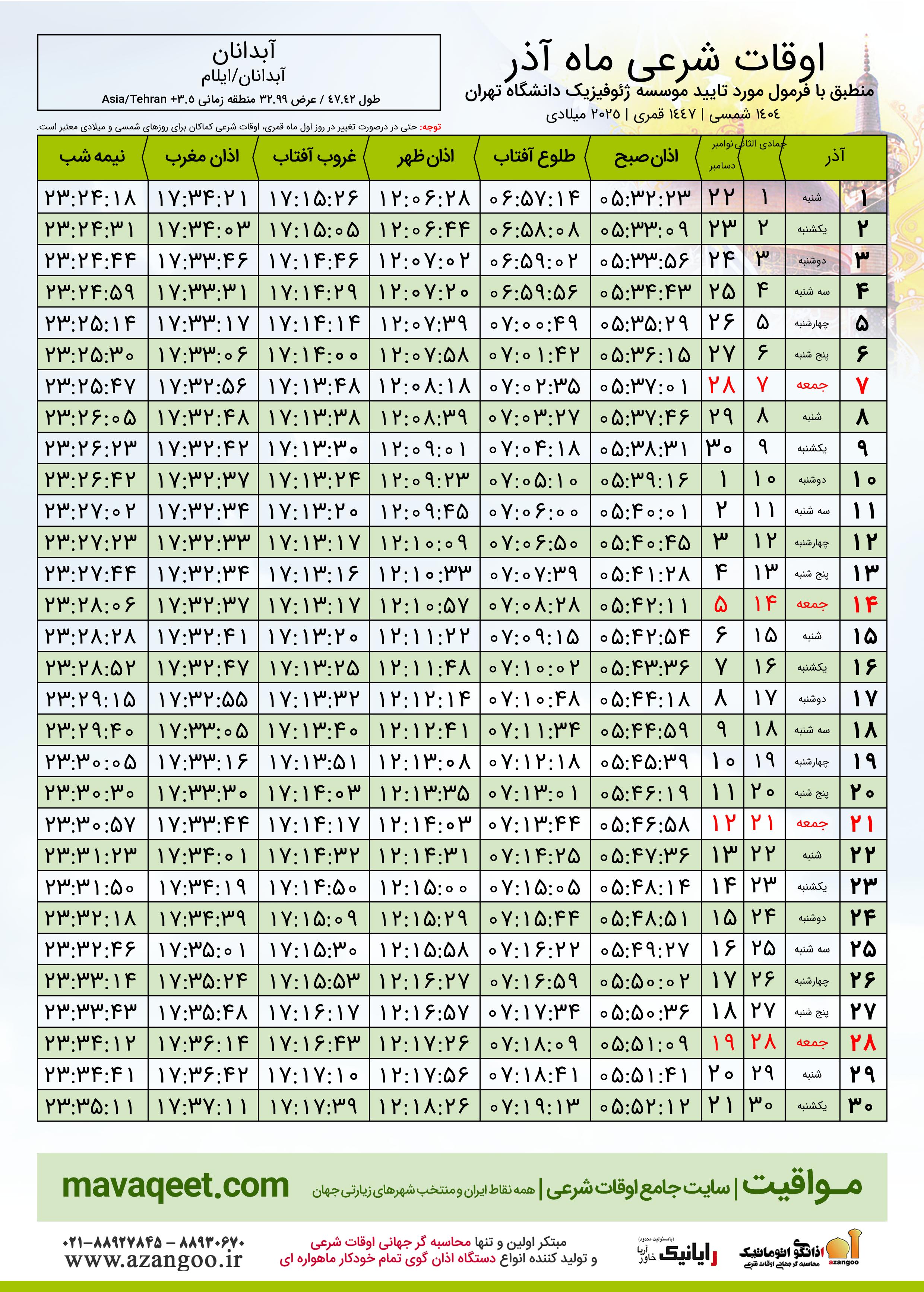 جدول اوقات شرعی آذر ١٤٠٤ شمسی شهر آبدانان