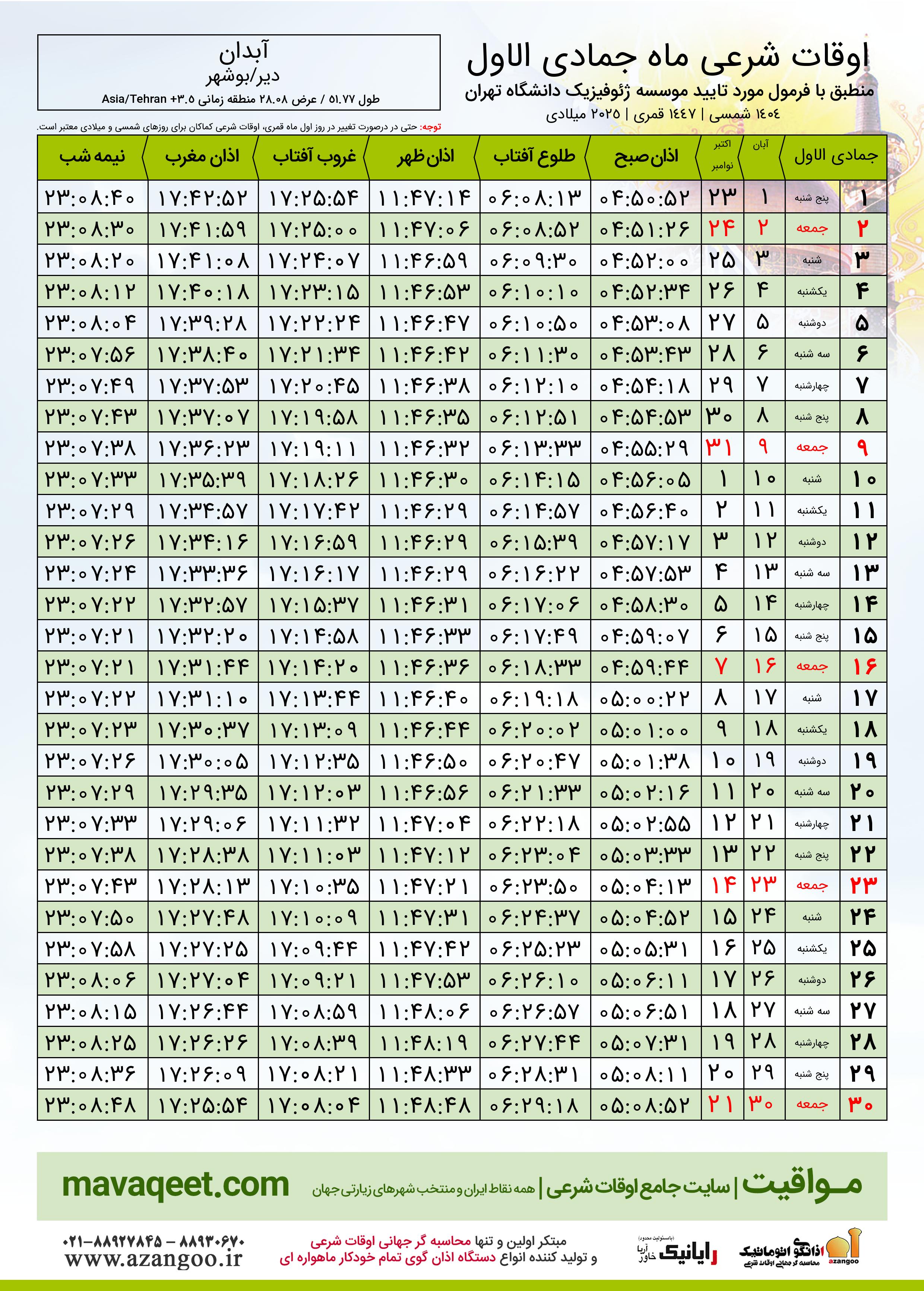 جدول اوقات شرعی جمادی الاول ١٤٤٧ قمری شهر آبدان