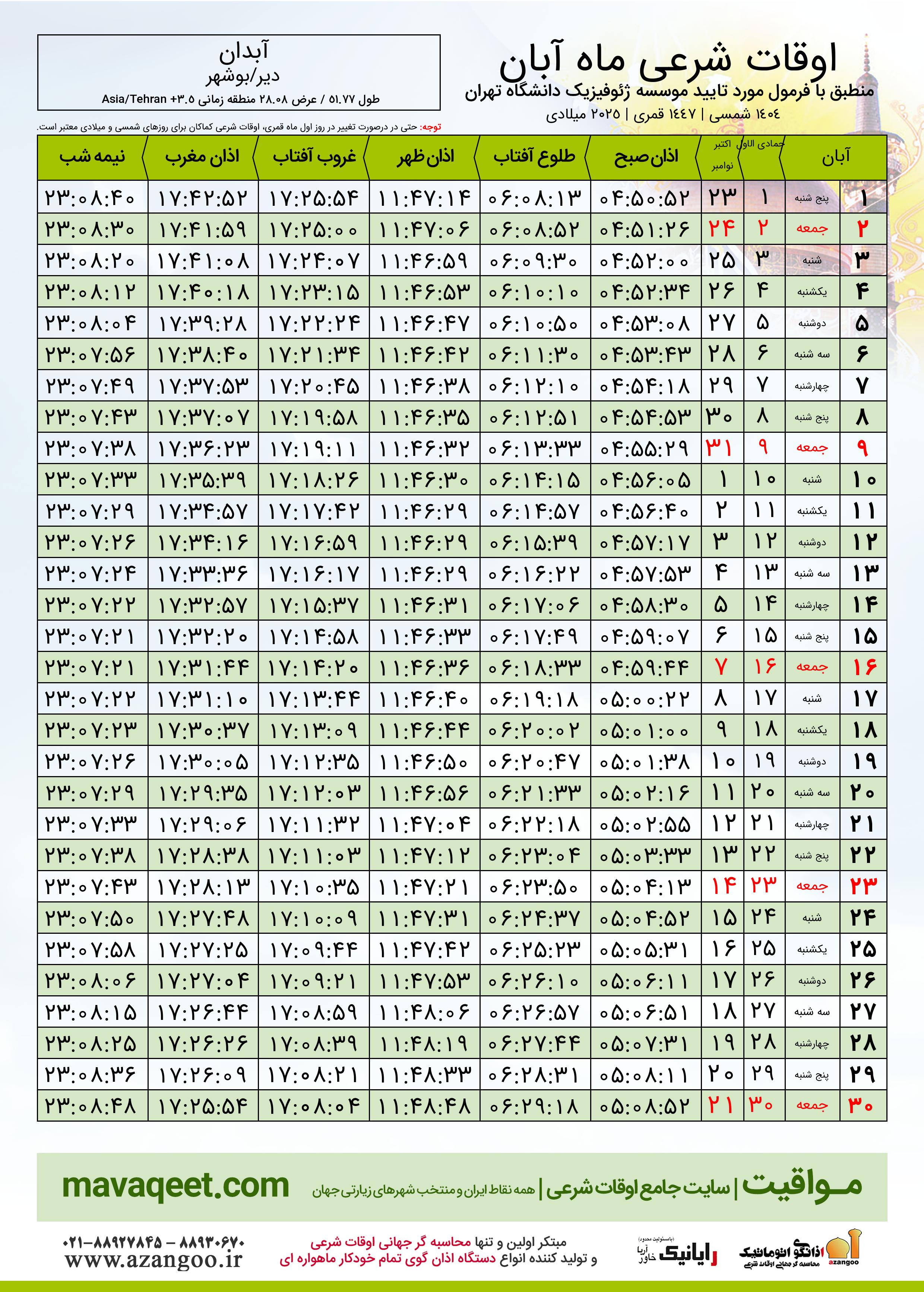 جدول اوقات شرعی آبان ١٤٠٤ شمسی شهر آبدان