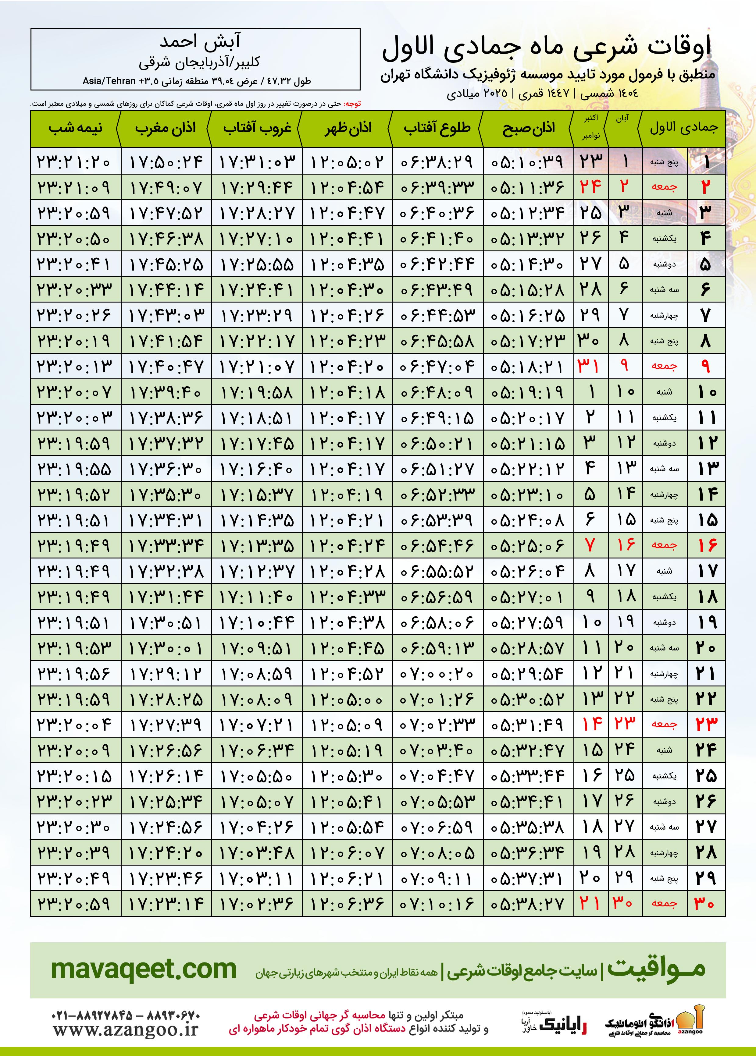 اوقات شرعی ماه جمادی الاول ١٤٤٧ هـ.ق شهر آبش احمد بر
