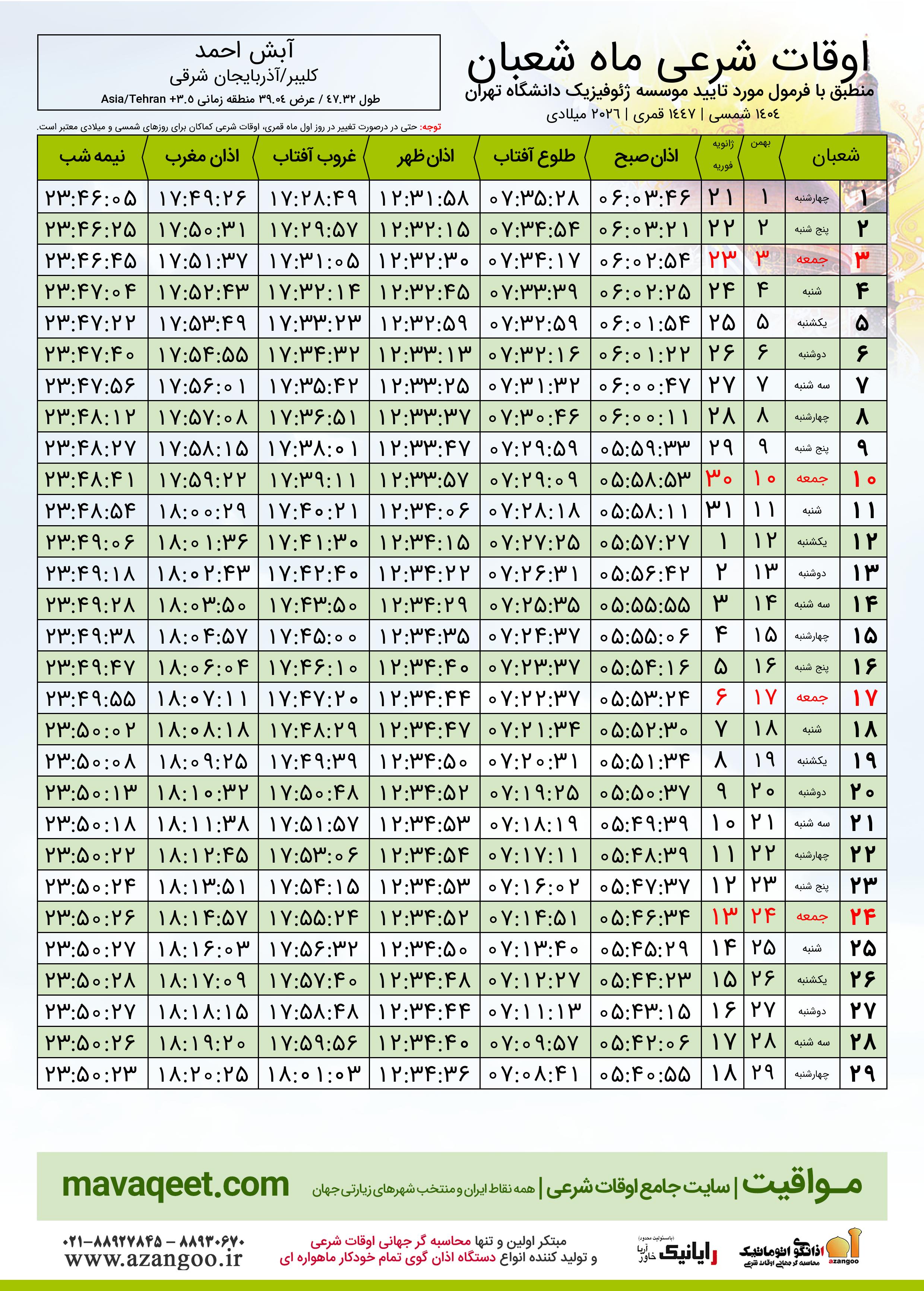 اوقات شرعی ماه شعبان ١٤٤٧ هـ.ق شهر آبش احمد بر
