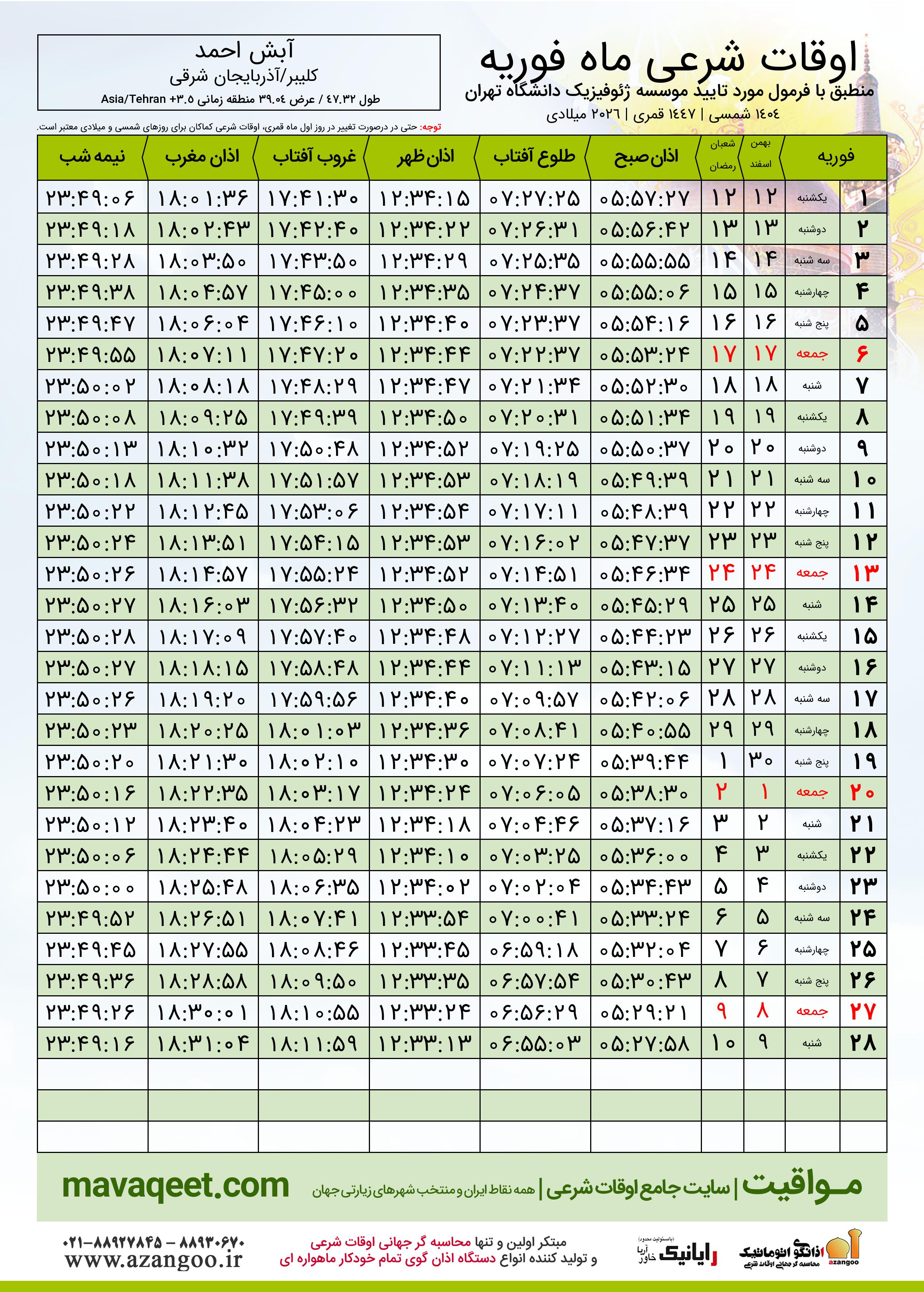 دانلود اوقات شرعی فوریه ٢٠٢٦ شهر آبش احمد