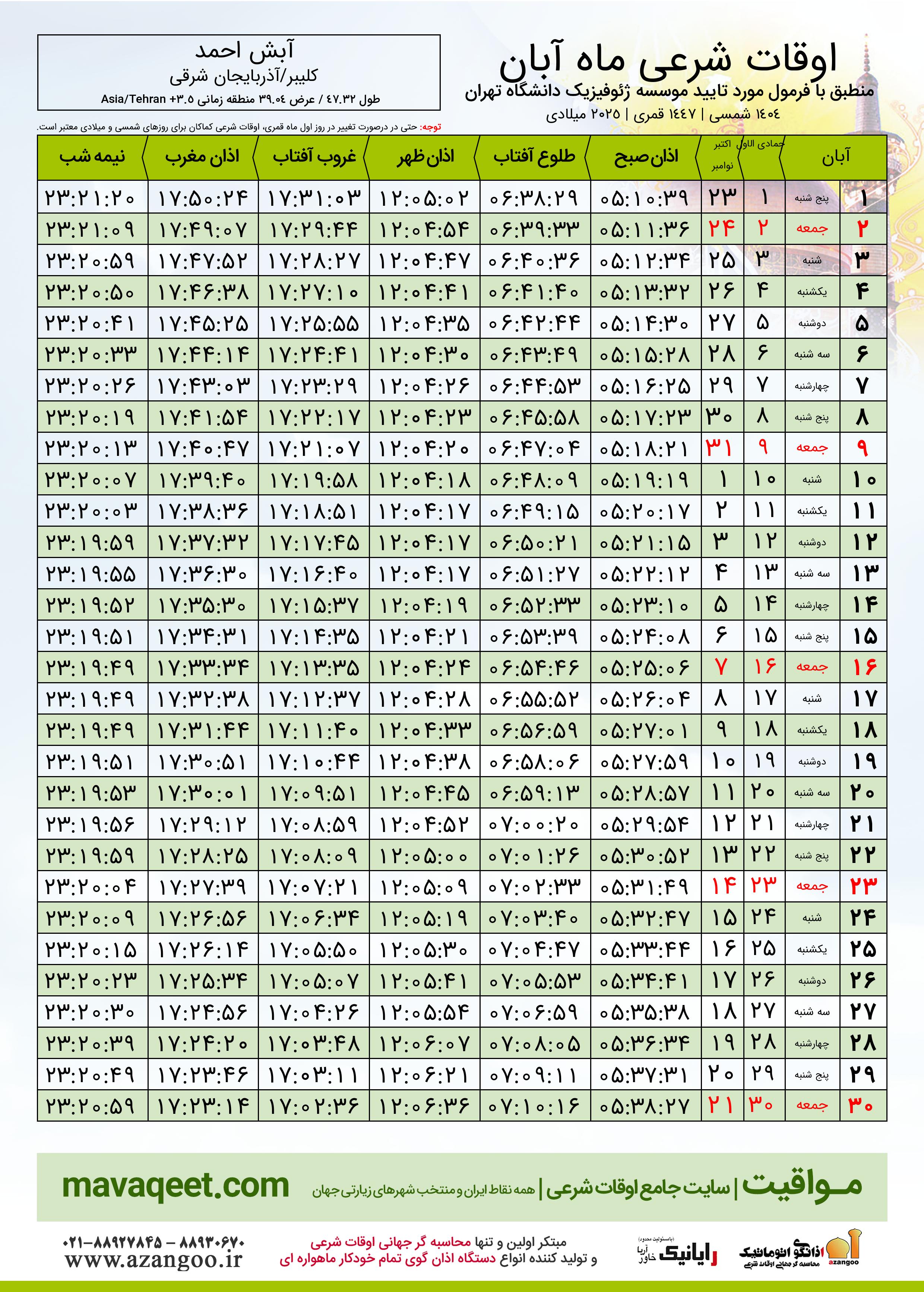 جدول اوقات شرعی آبان ١٤٠٤ شمسی شهر آبش احمد