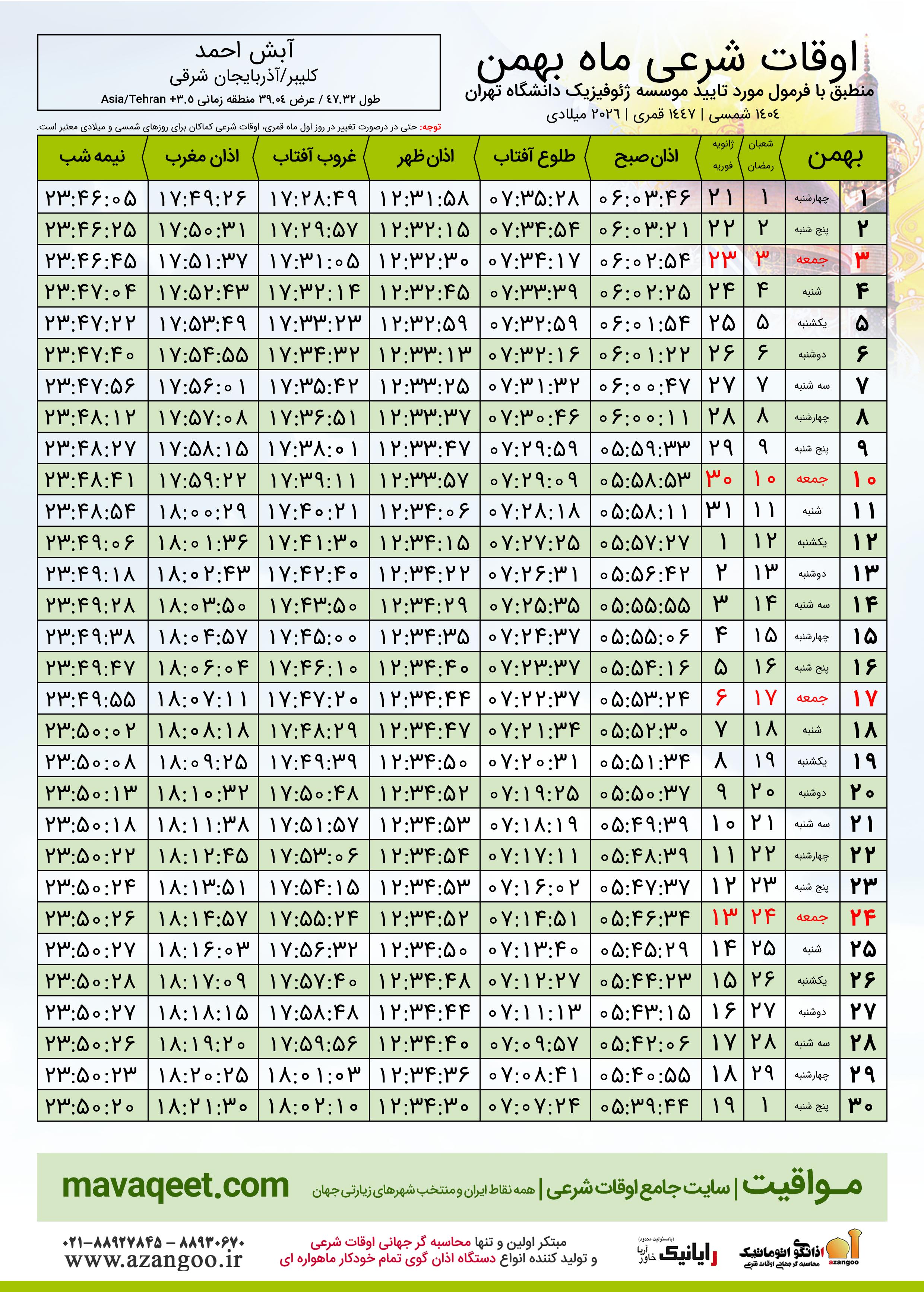 دانلود اوقات شرعی بهمن ٠٤ - ١٤٠٤ شهر آبش احمد