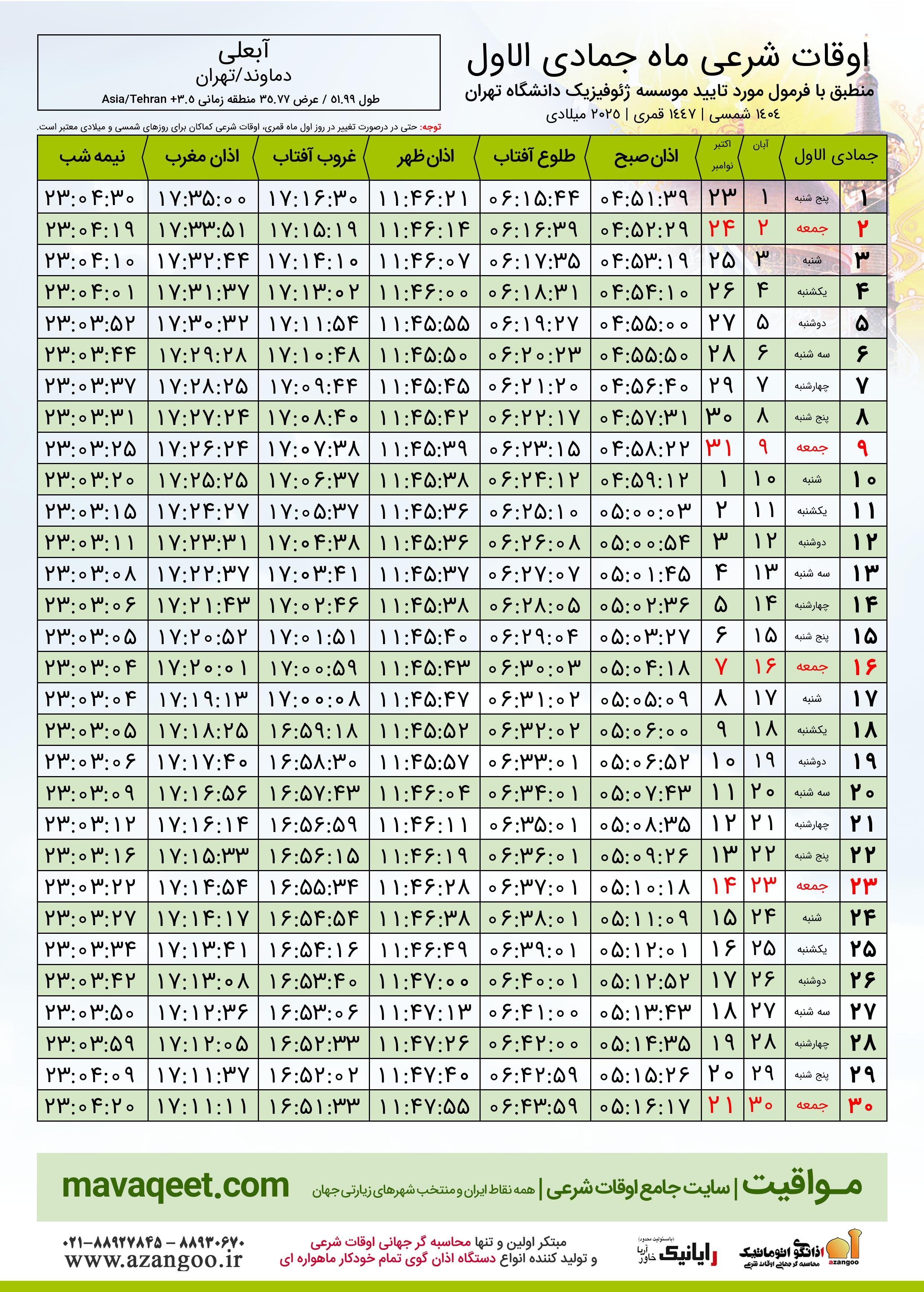 جدول اوقات شرعی جمادی الاول ١٤٤٧ قمری شهر آبعلی
