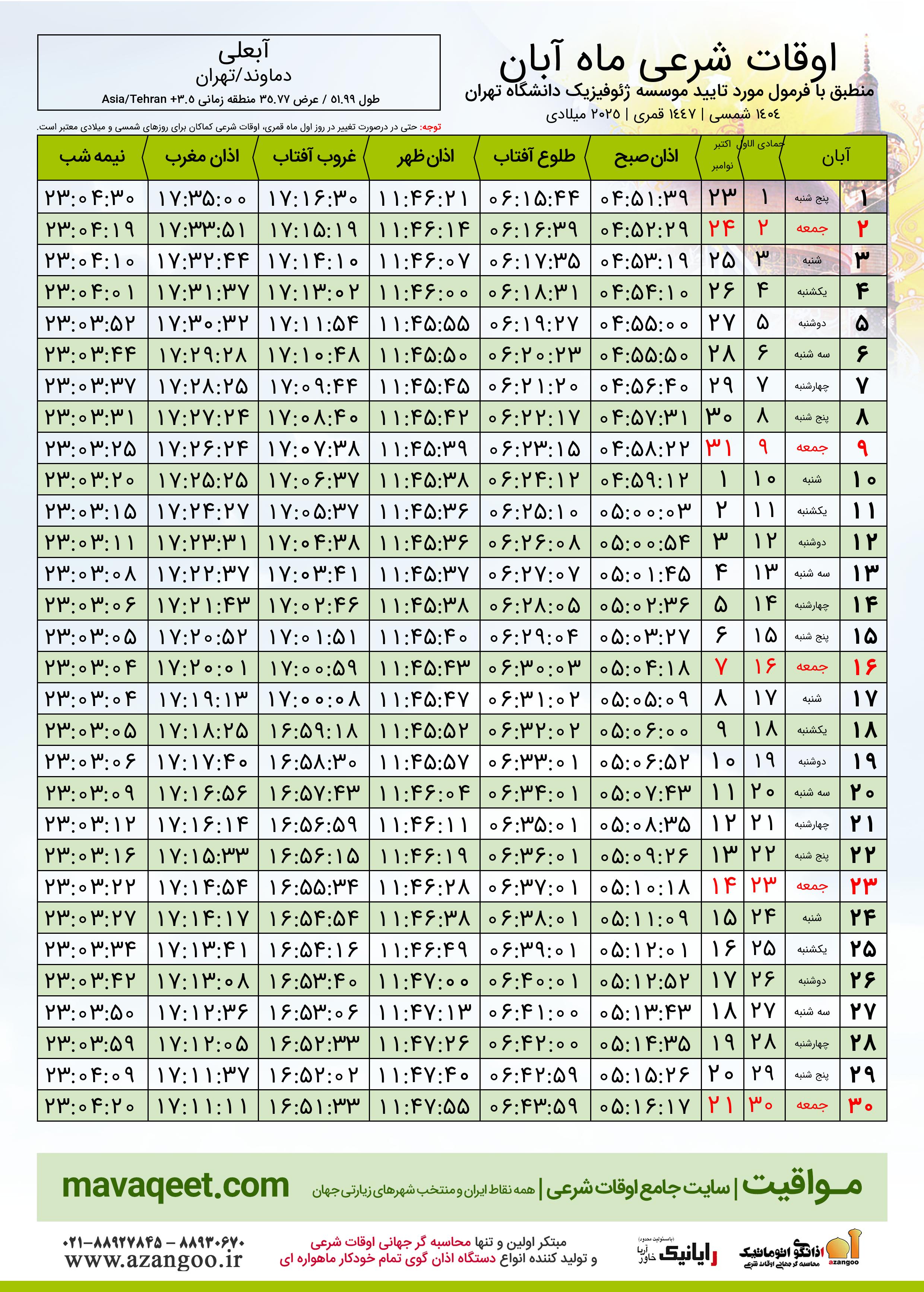 جدول اوقات شرعی آبان ١٤٠٤ شمسی شهر آبعلی