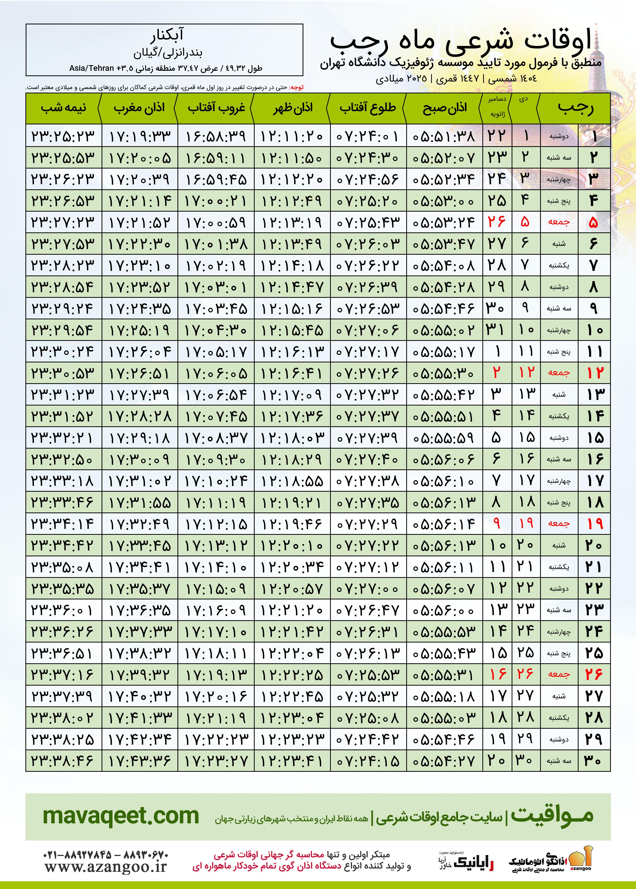 اوقات شرعی ماه رجب ١٤٤٧ هـ.ق شهر آبکنار بر