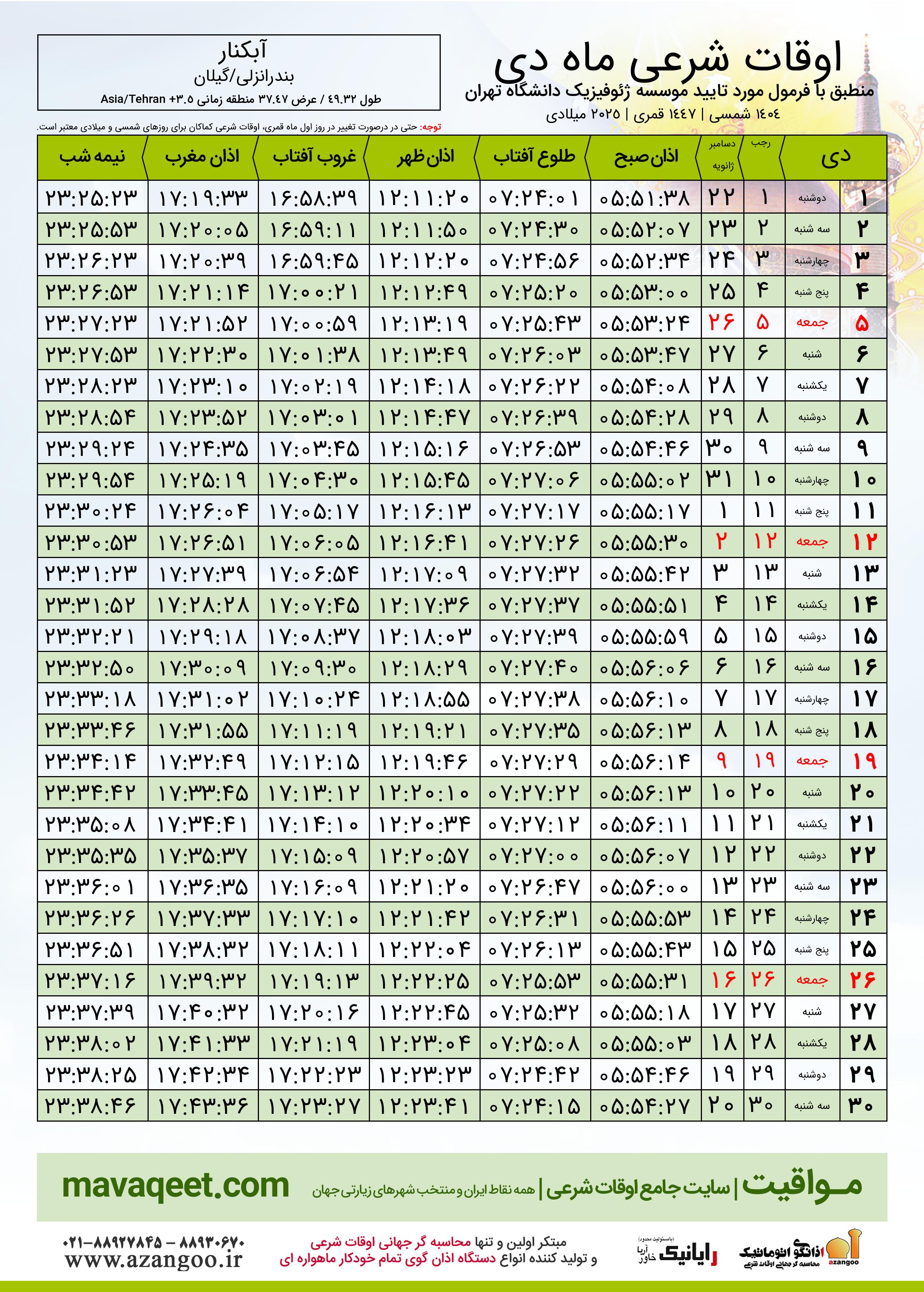 جدول اوقات شرعی دسامبر ٢٠٢٥ میلادی شهر آبکنار