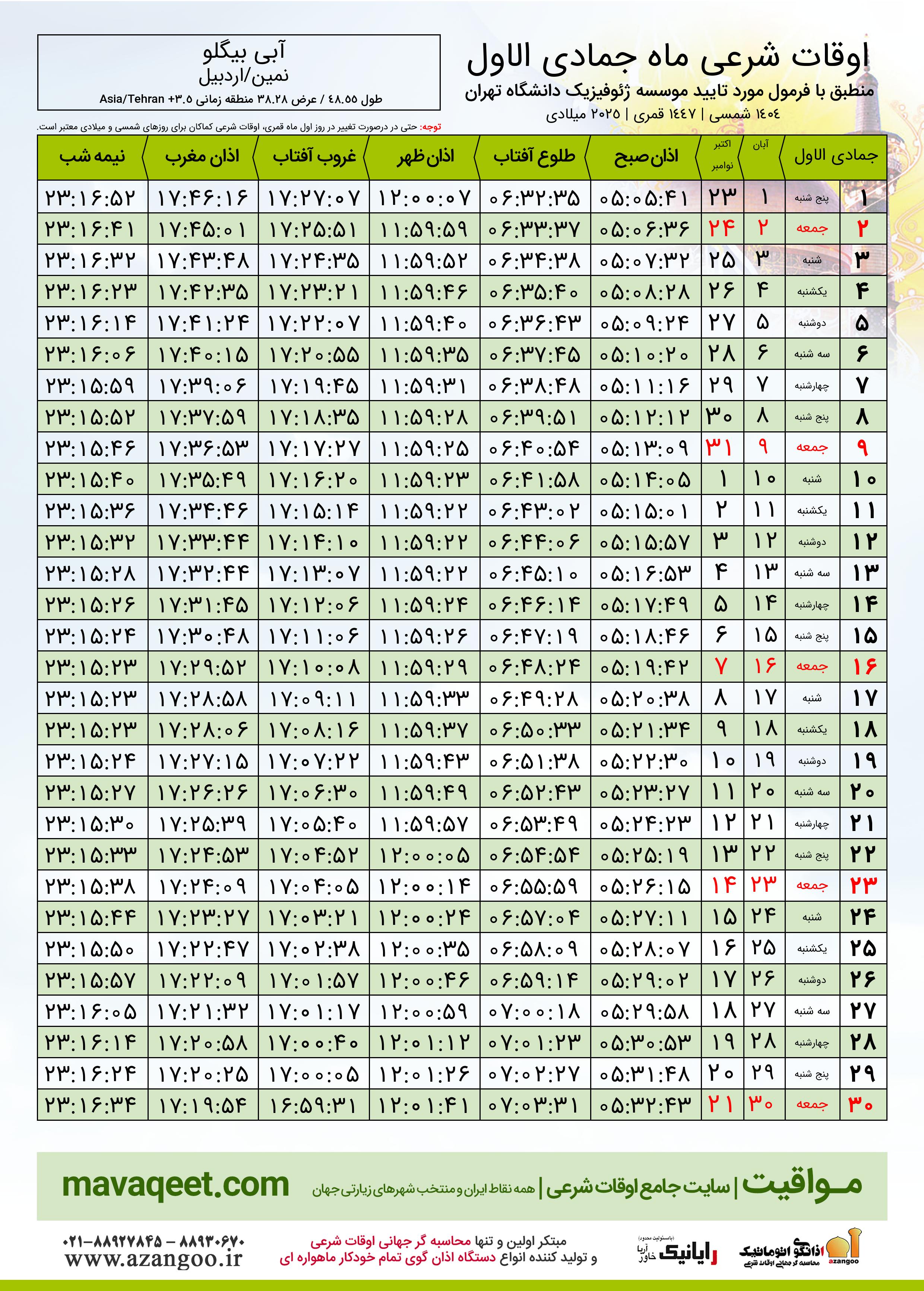 جدول اوقات شرعی جمادی الاول ١٤٤٧ قمری شهر آبی بیگلو