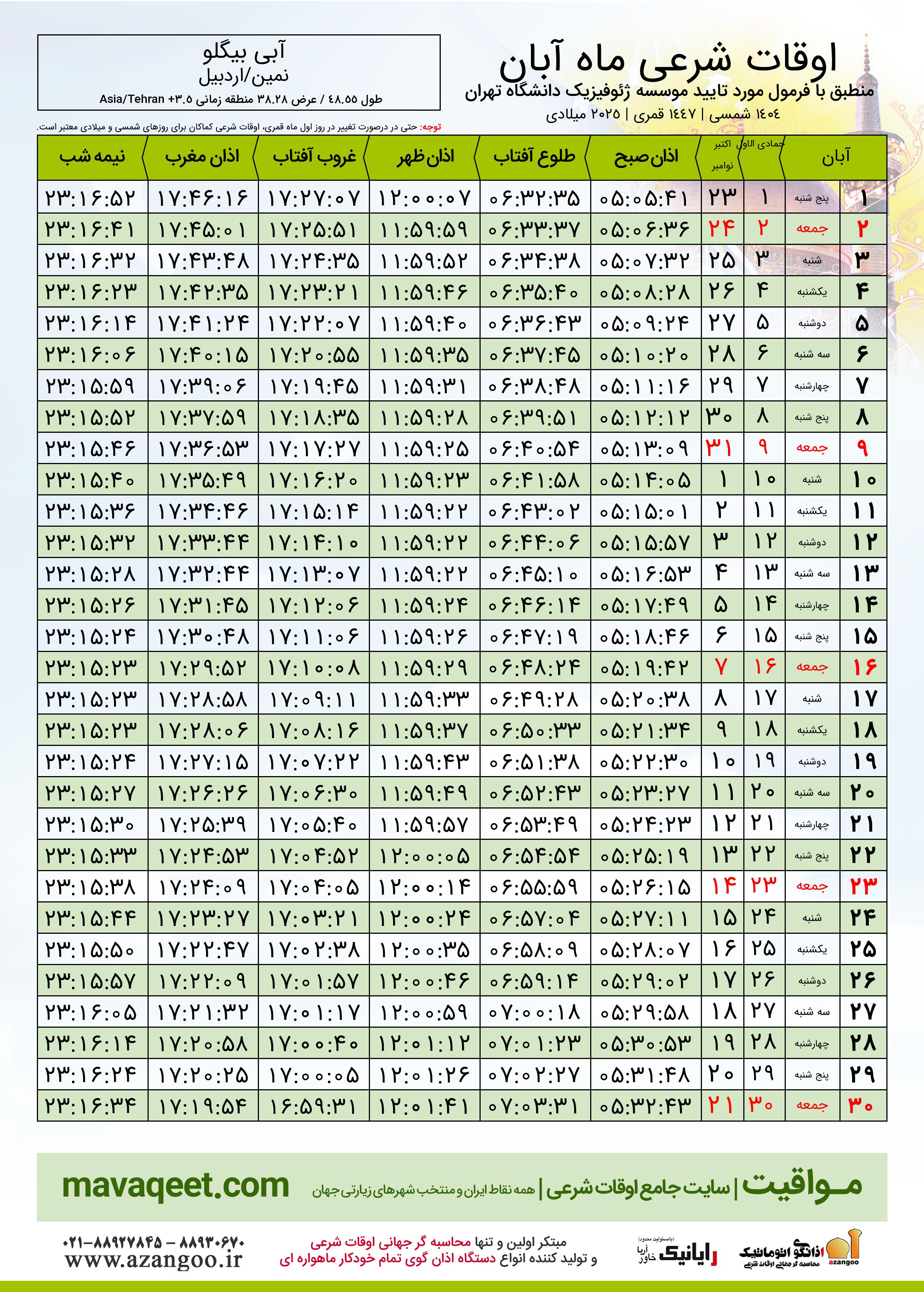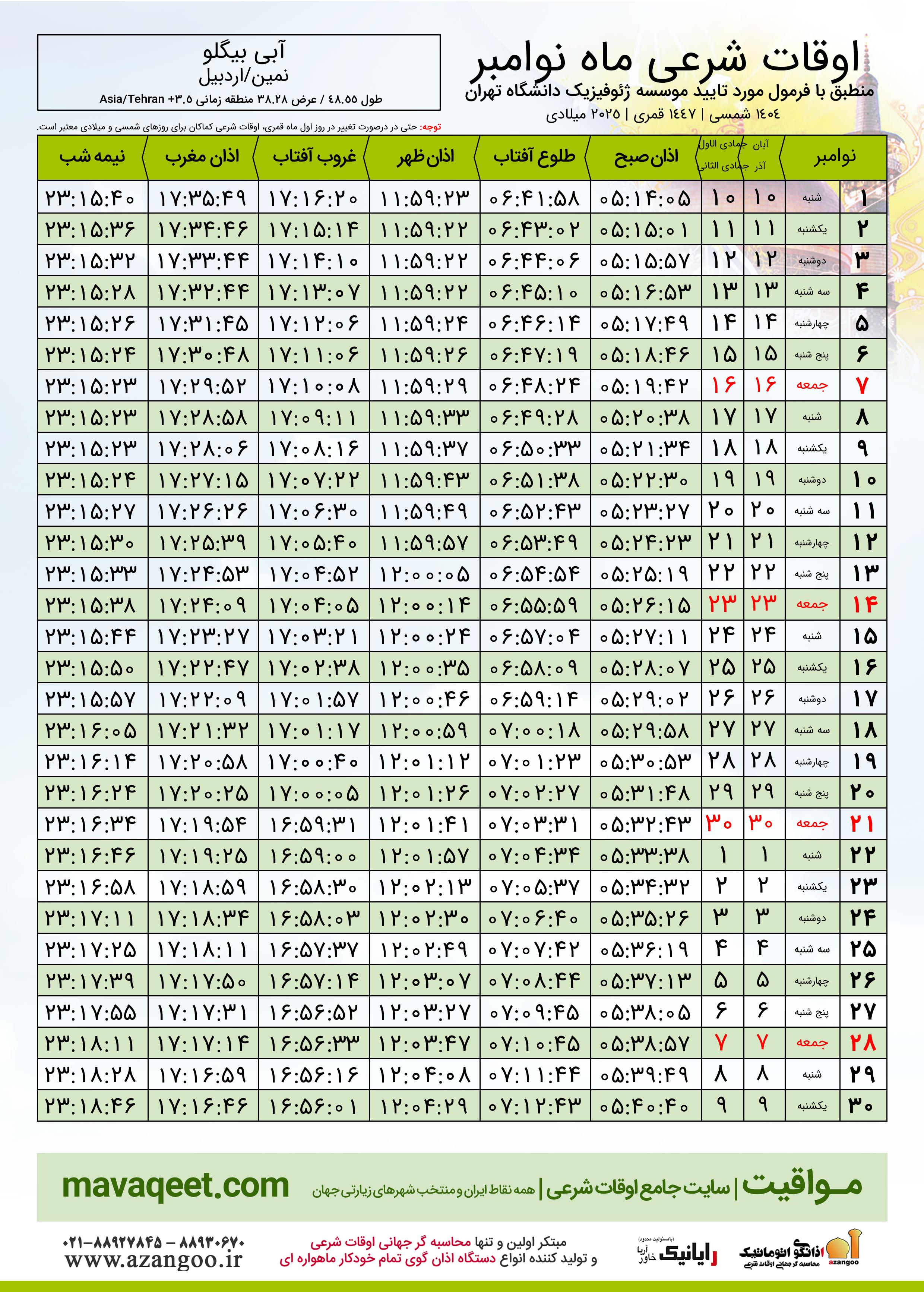 جدول اوقات شرعی نوامبر ٢٠٢٥ میلادی شهر آبی بیگلو