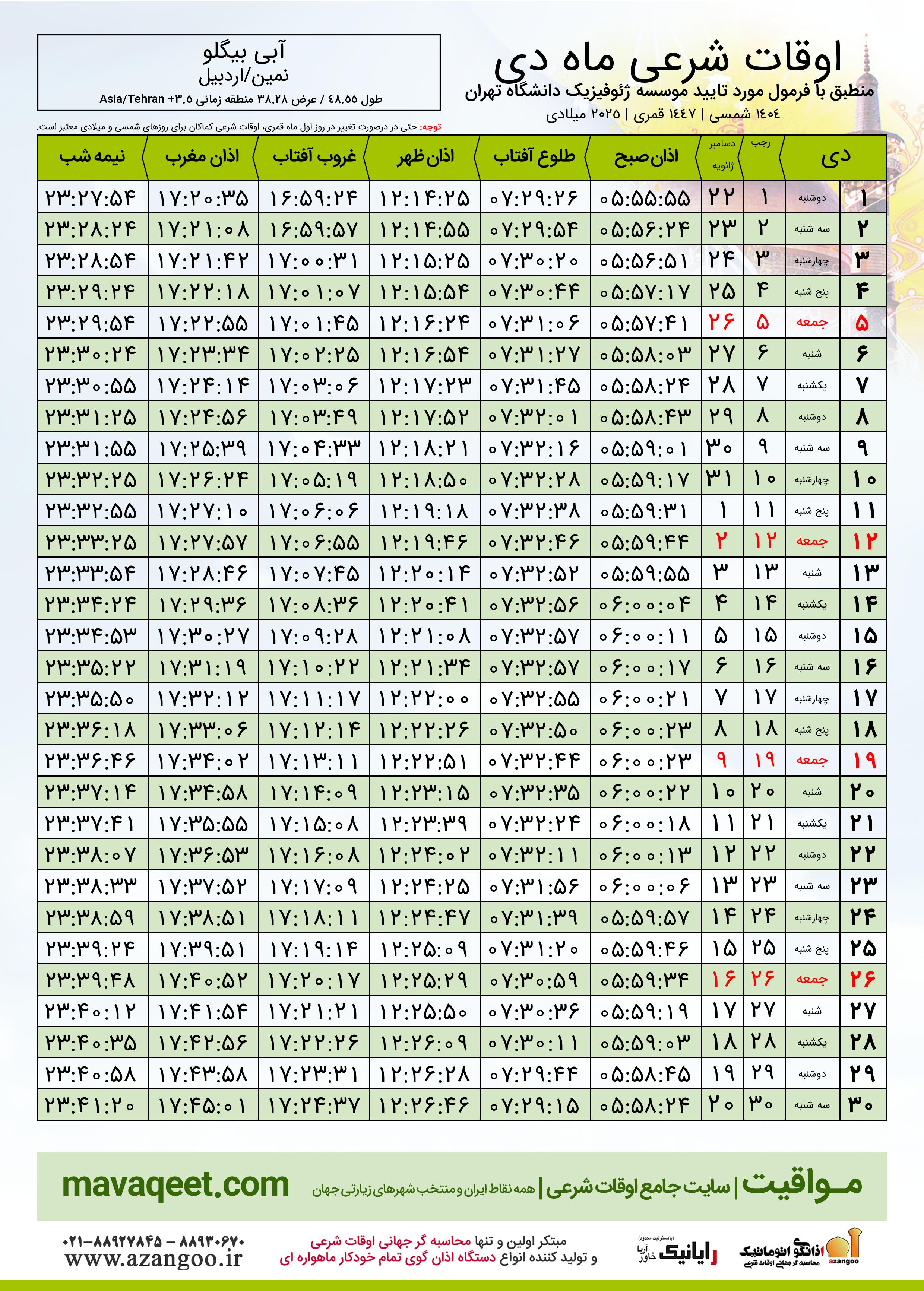 جدول اوقات شرعی دسامبر ٢٠٢٥ میلادی شهر آبی بیگلو
