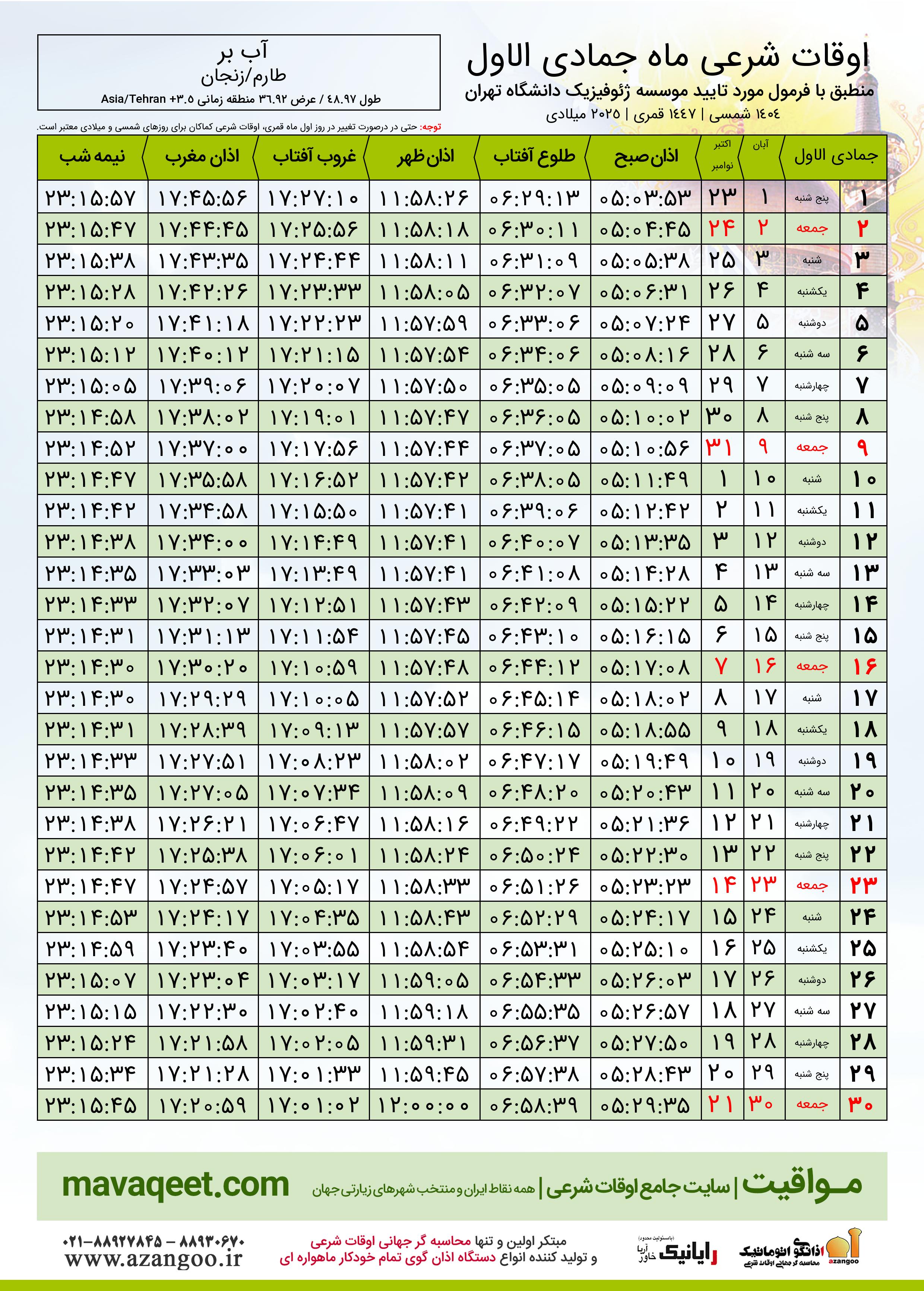 جهت نمایش تصویر جدول اوقات شرعی ماه جمادی الاول ١٤٤٧ هـ.ق شهر آب بر در اندازه