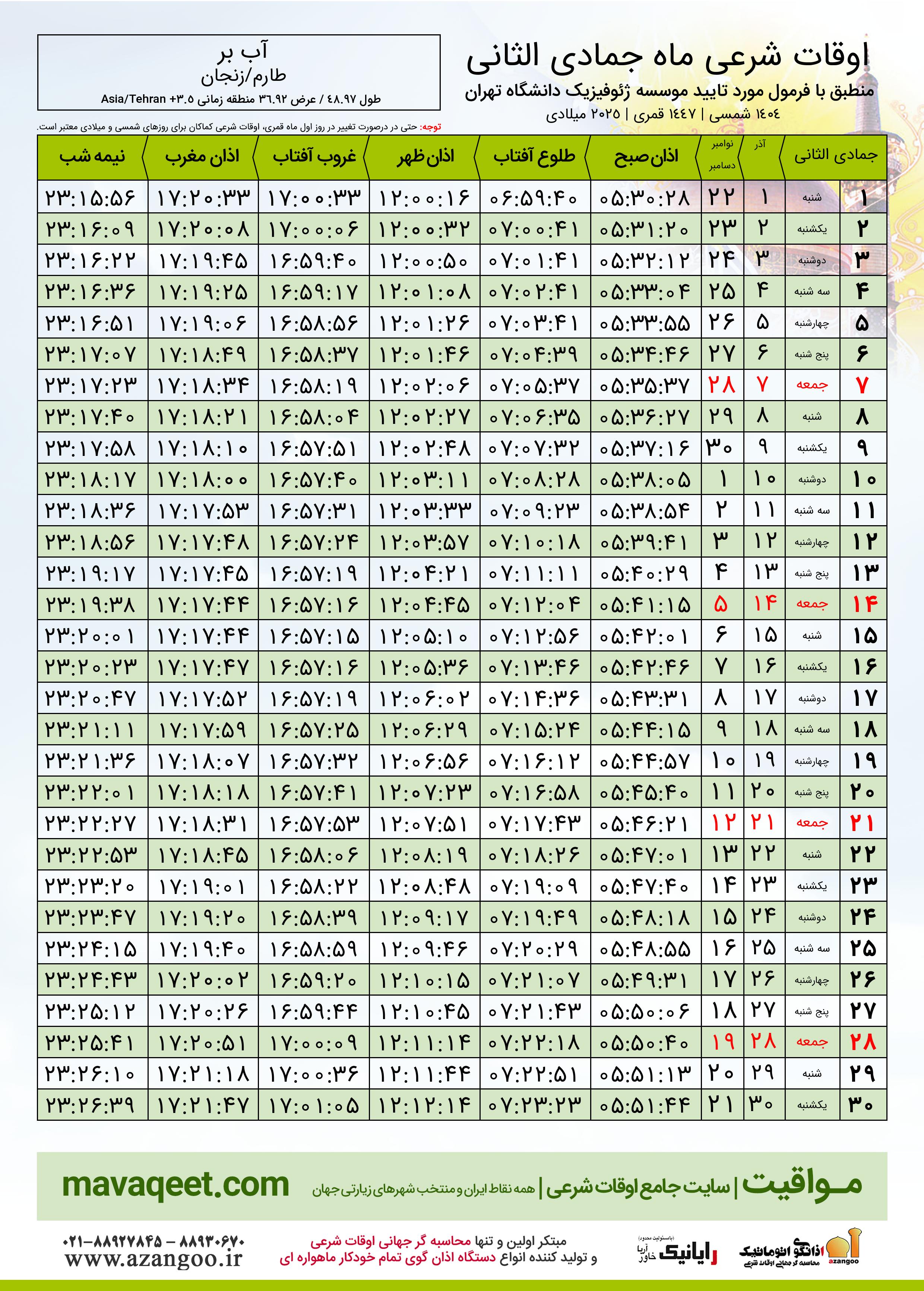 جهت نمایش تصویر جدول اوقات شرعی ماه جمادی الثانی ١٤٤٧ هـ.ق شهر آب بر در اندازه