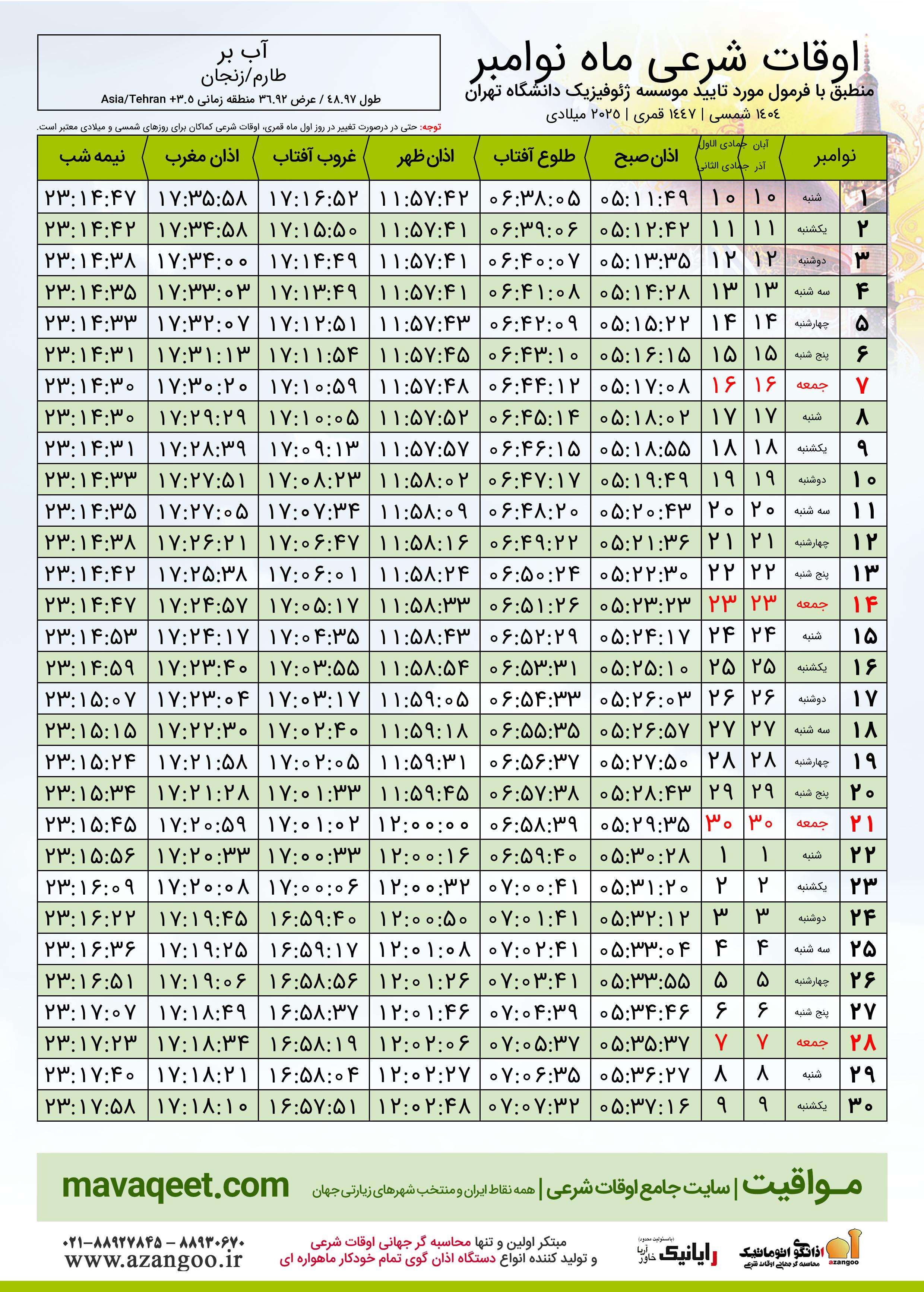 جهت نمایش تصویر جدول اوقات شرعی جدول اوقات شرعی نوامبر ٢٠٢٥ میلادی شهر آب بر شهر آب بر در اندازه