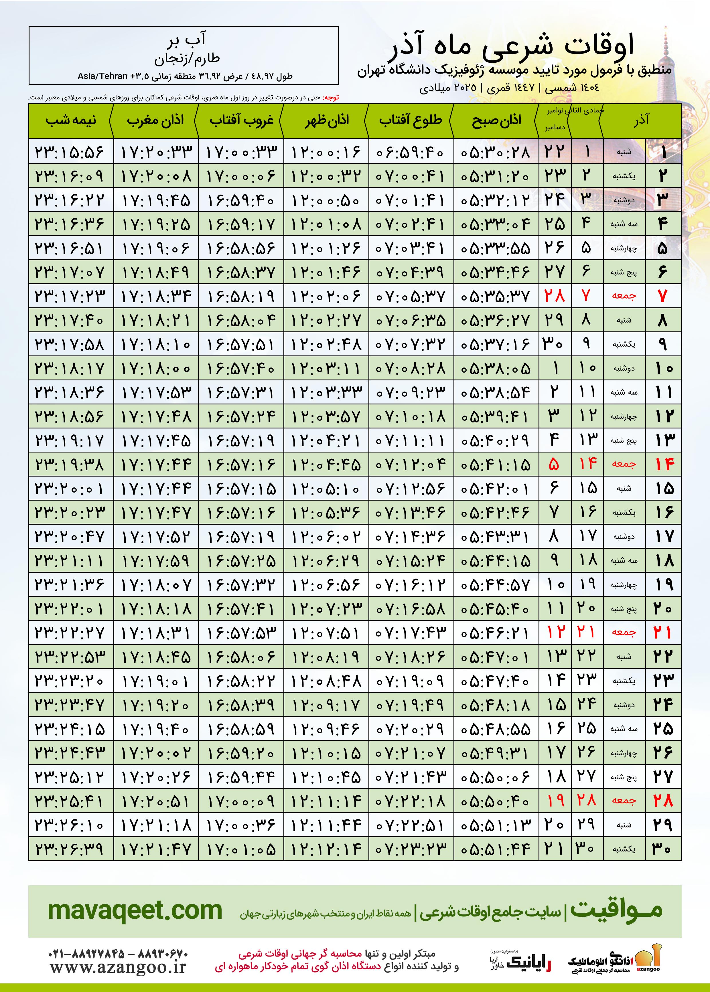 اوقات شرعی آذر ١٤٠٤ شمسی شهر آب بر