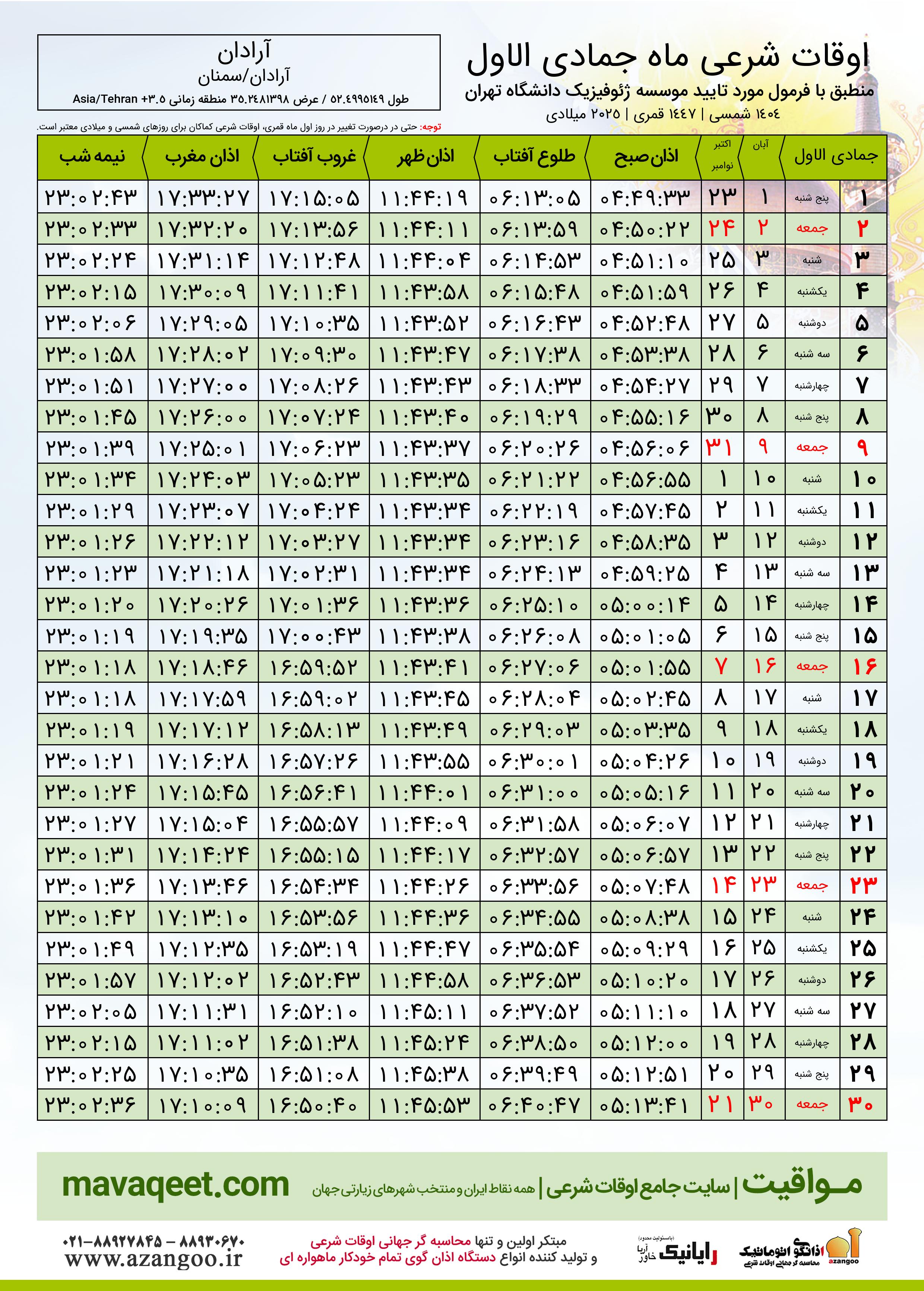 جدول اوقات شرعی جمادی الاول ١٤٤٧ قمری شهر آرادان