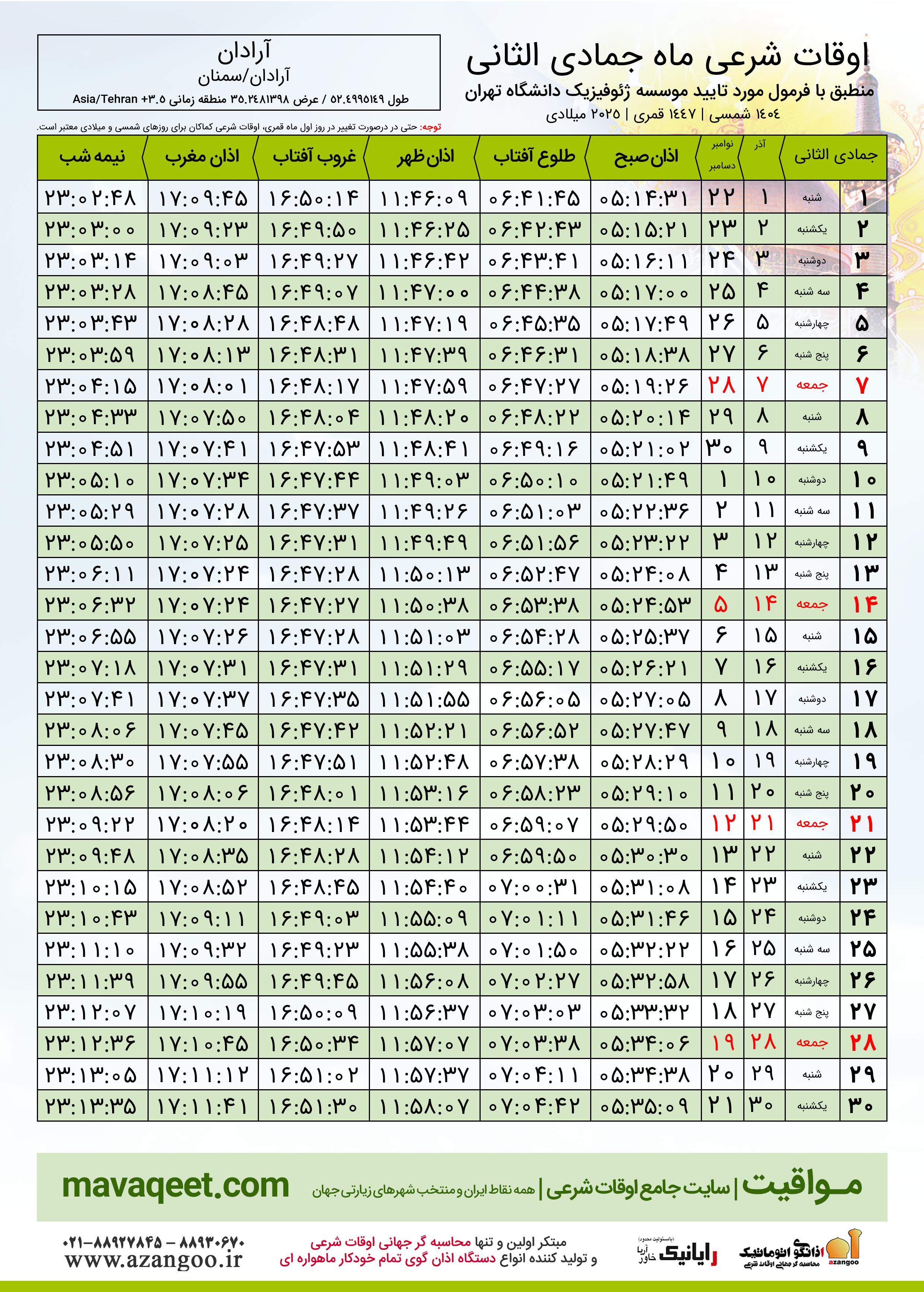 اوقات شرعی ماه جمادی الثانی ١٤٤٧ هـ.ق شهر آرادان بر