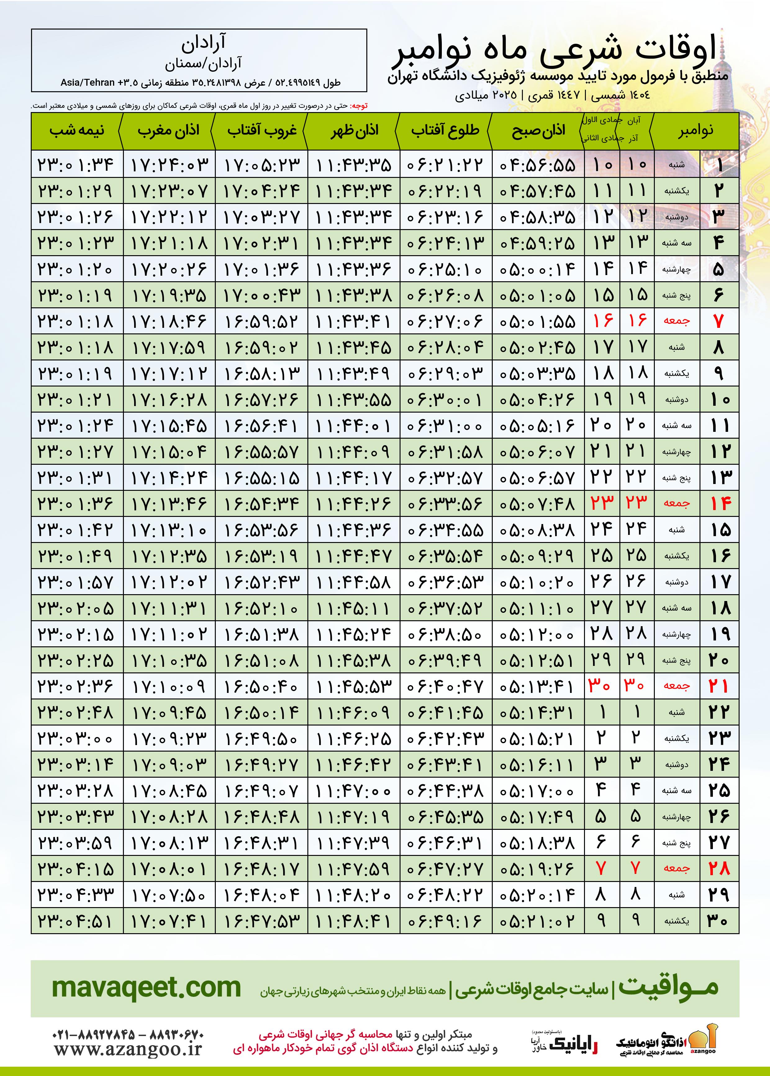 دانلود اوقات شرعی نوامبر ٢٠٢٥ شهر آرادان