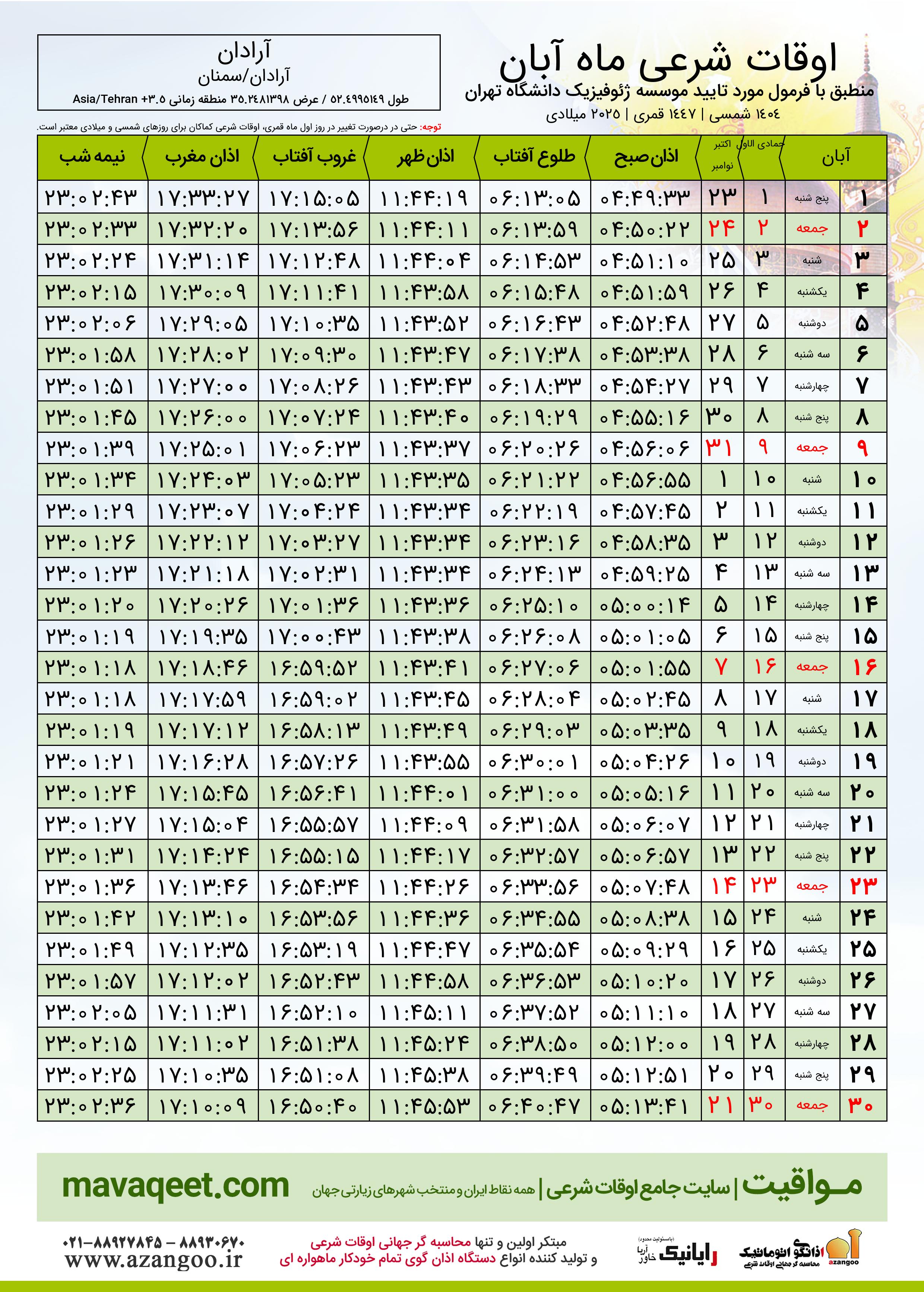 اوقات شرعی آبان ١٤٠٤ شمسی شهر آرادان