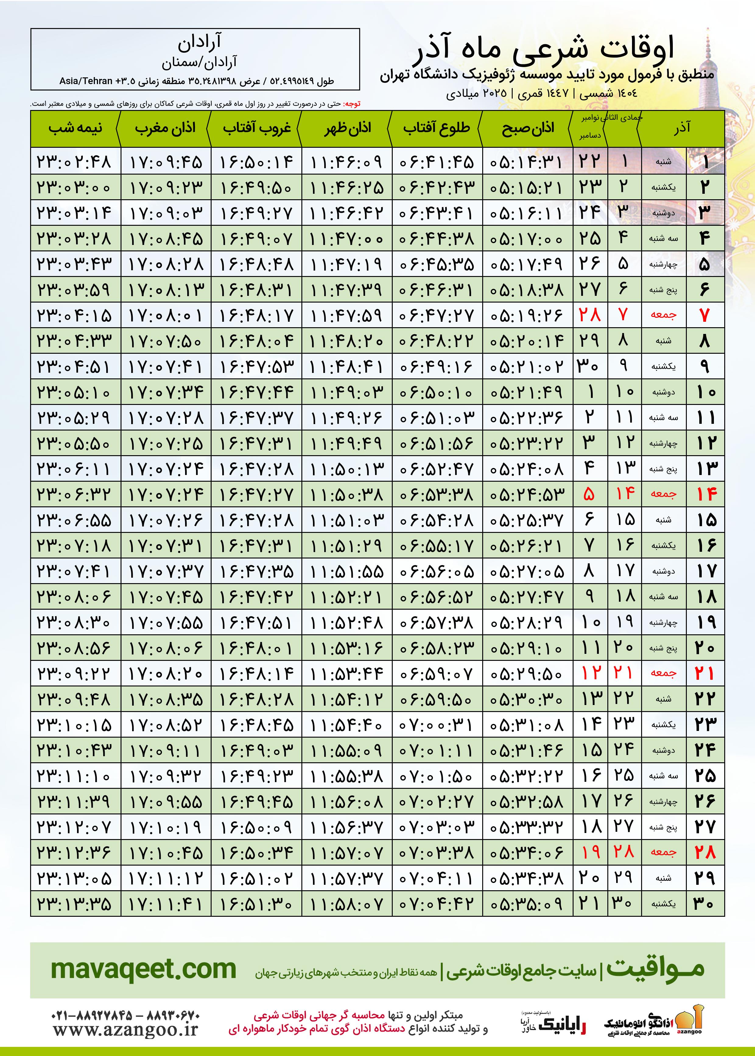 دانلود اوقات شرعی آذر ٠٤ - ١٤٠٤ شهر آرادان