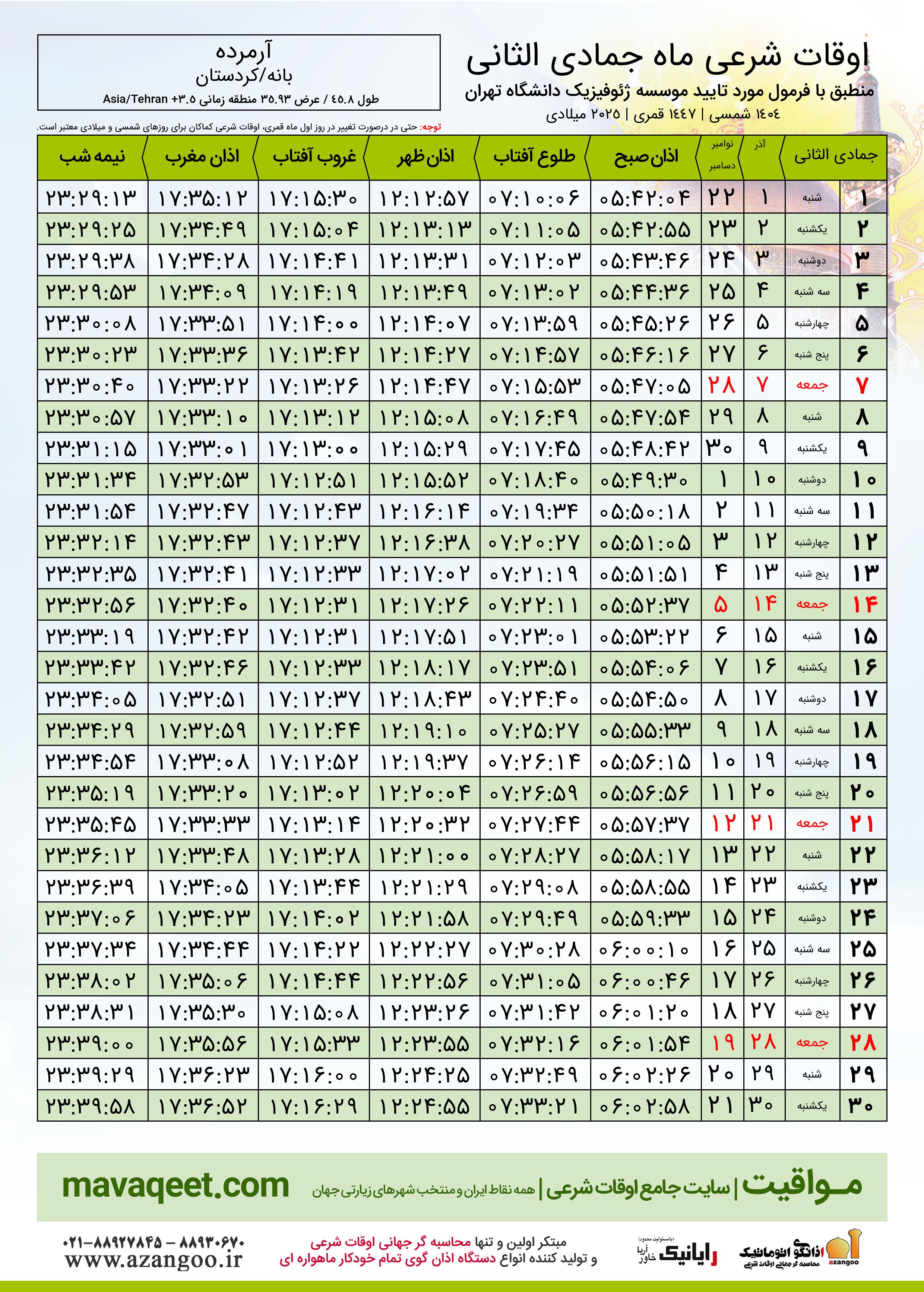 جدول اوقات شرعی جمادی الثانی ١٤٤٧ قمری شهر آرمرده