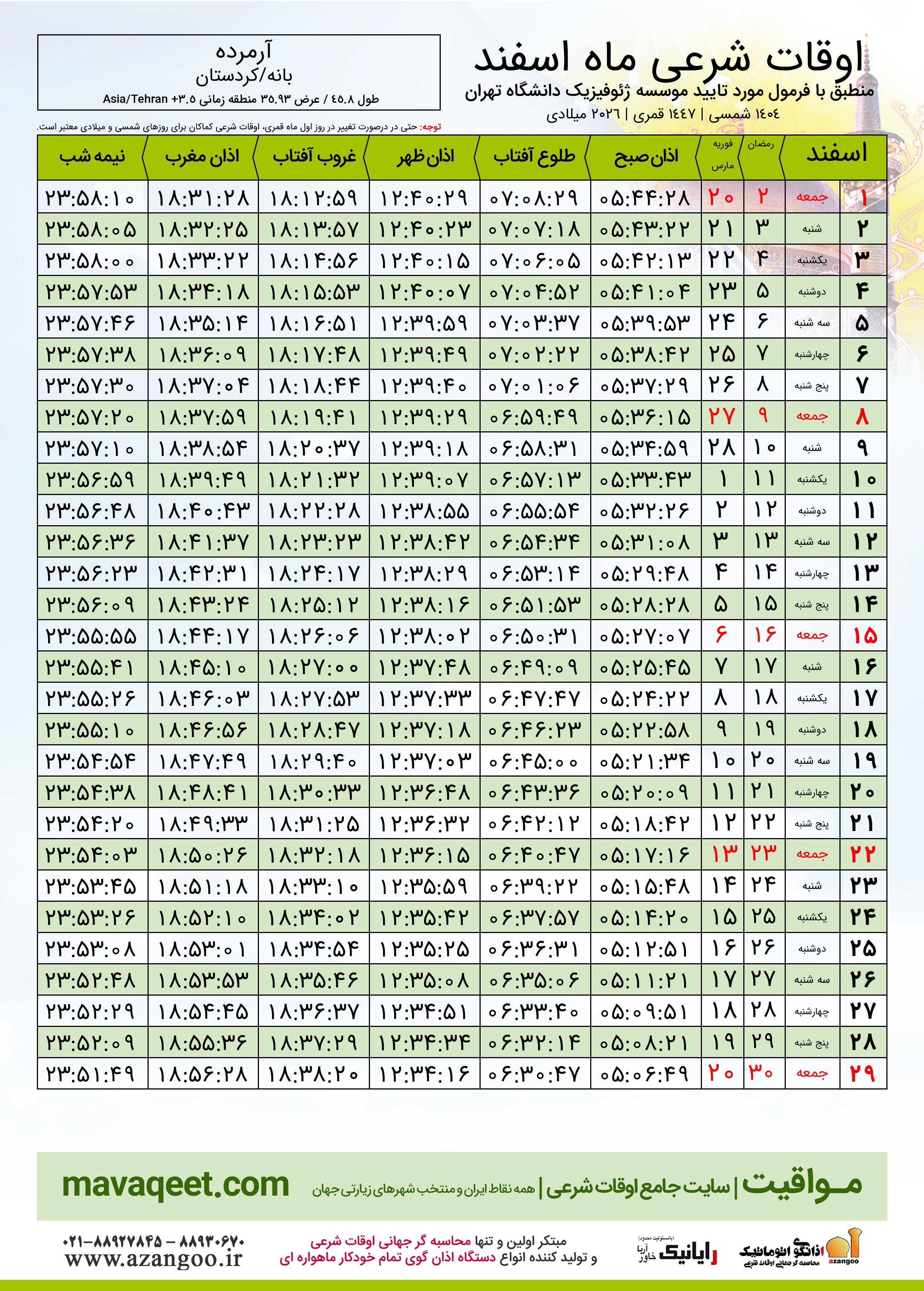 | ٢٦ اسفند ١٤٠٤ | ٠٥:١١:٢١ | ٠٦:٣٥:٠٦ | ١٢:٣٥:٠٨ | ١٨:٣٥:٤٦ | ١٨:٥٣:٥٣ | ٢٣:٥٢:٤٨ |