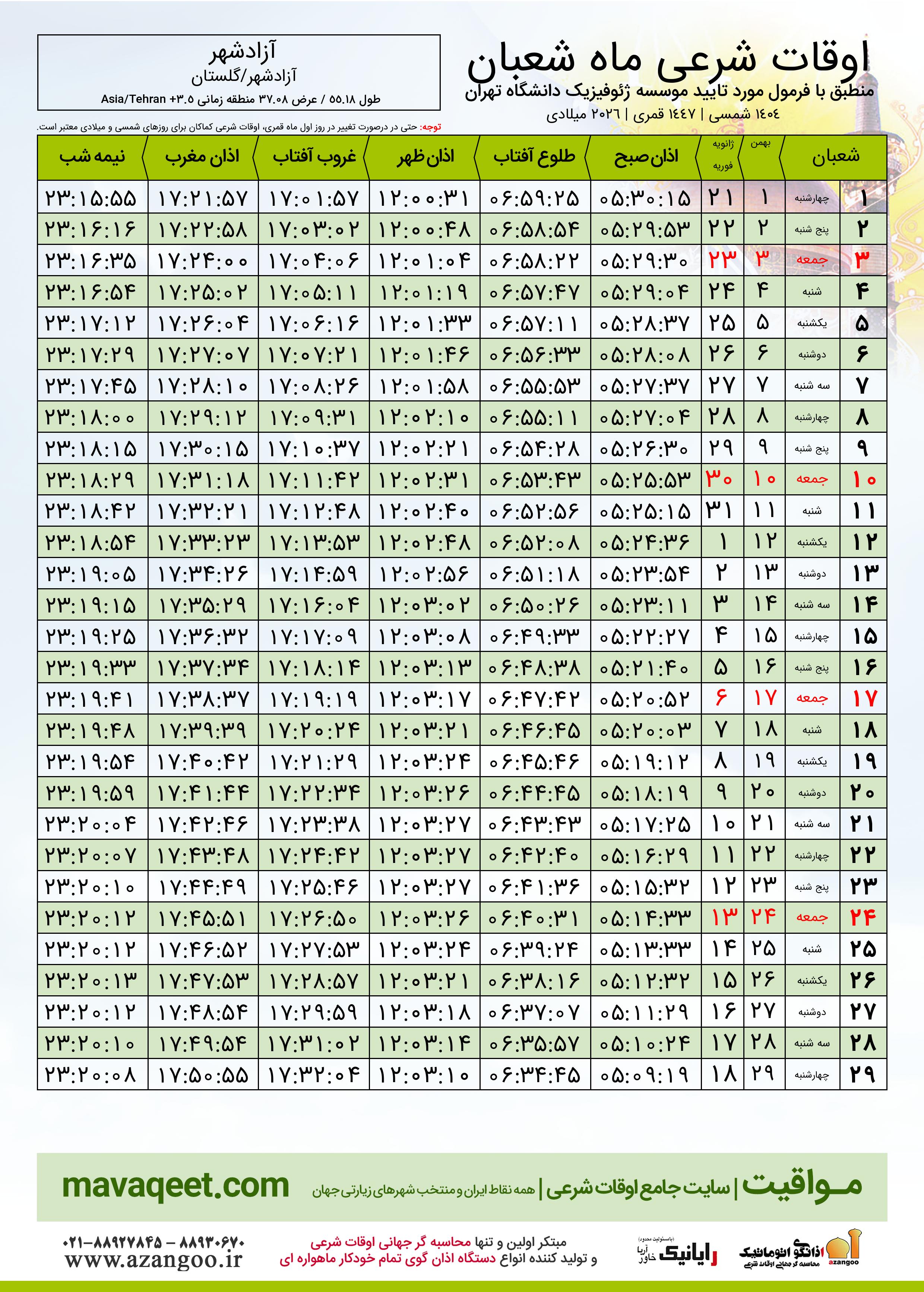 اوقات شرعی شعبان ١٤٤٧ قمری شهر آزادشهر