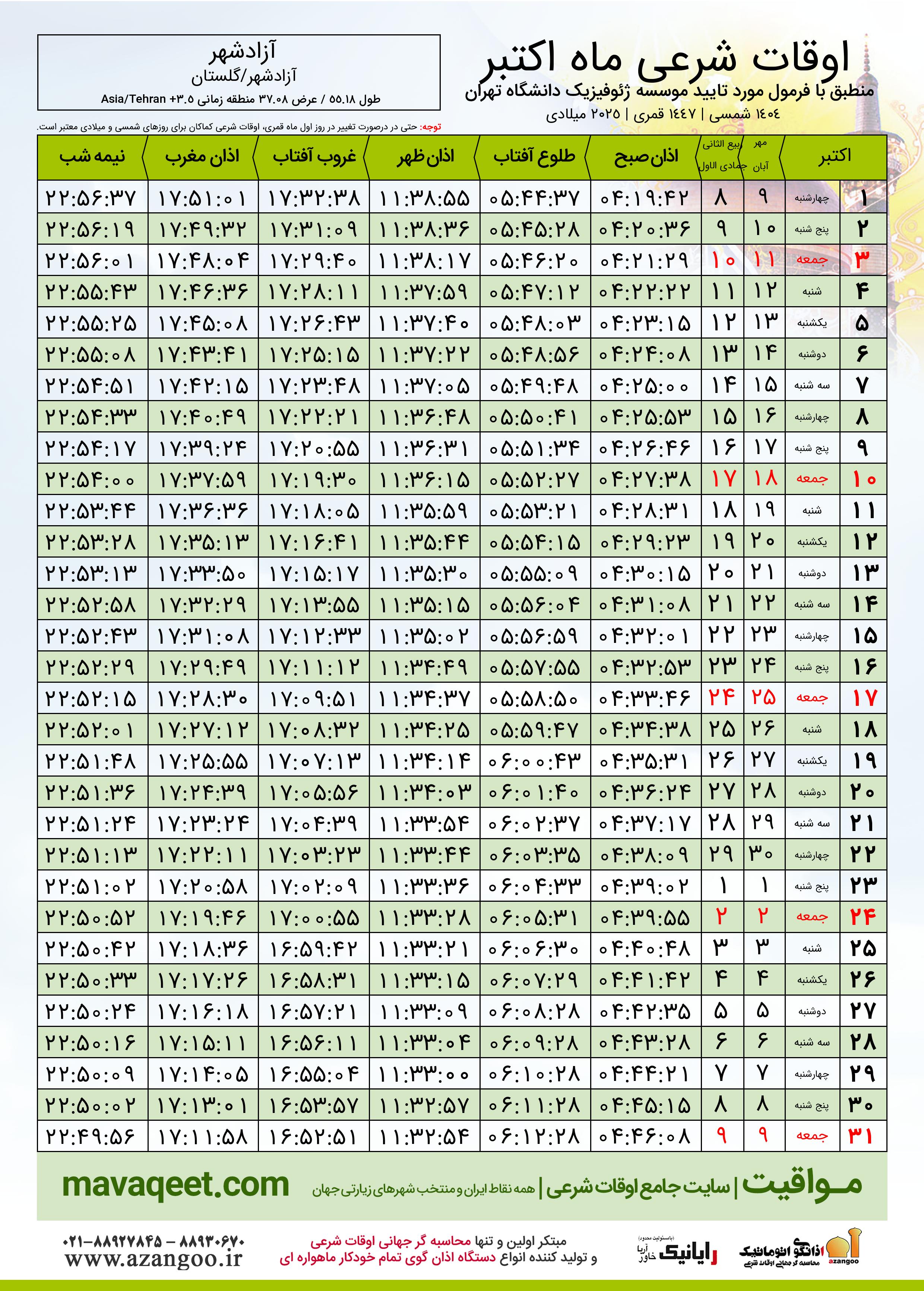 اوقات شرعی اکتبر ٢٠٢٥ میلادی شهر آزادشهر