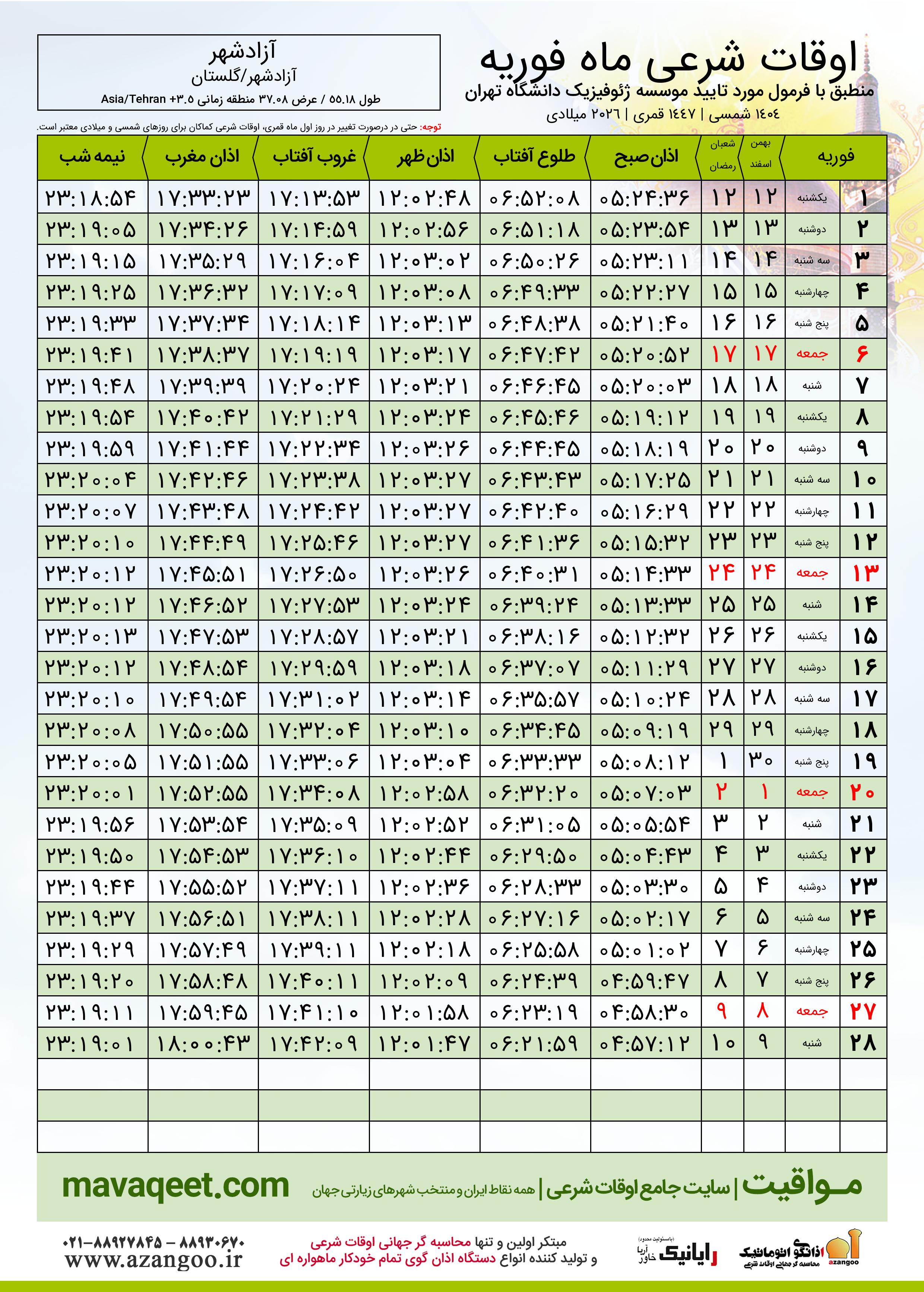 دانلود اوقات شرعی فوریه ٢٠٢٦ شهر آزادشهر