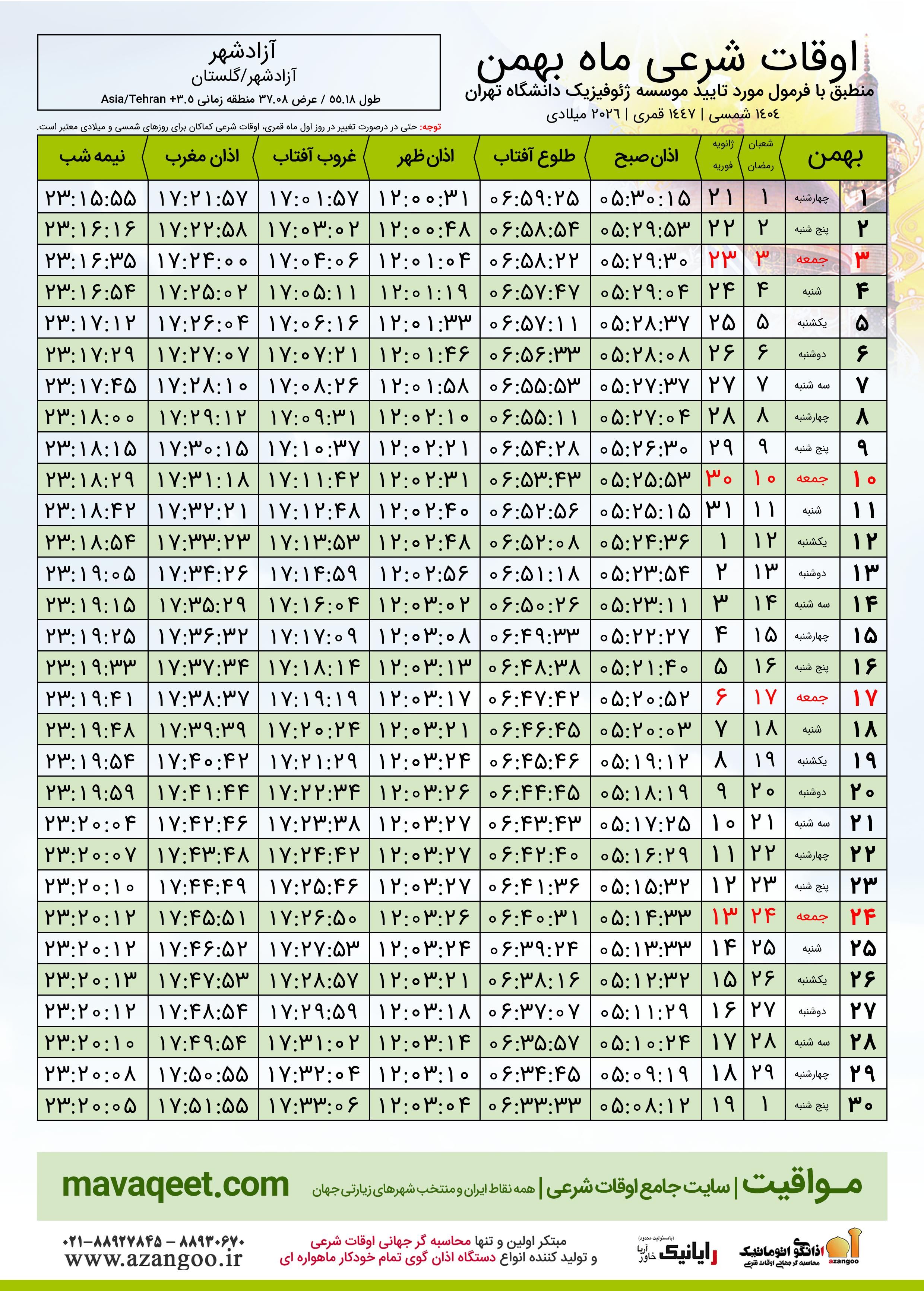 دانلود اوقات شرعی بهمن ٠٤ - ١٤٠٤ شهر آزادشهر