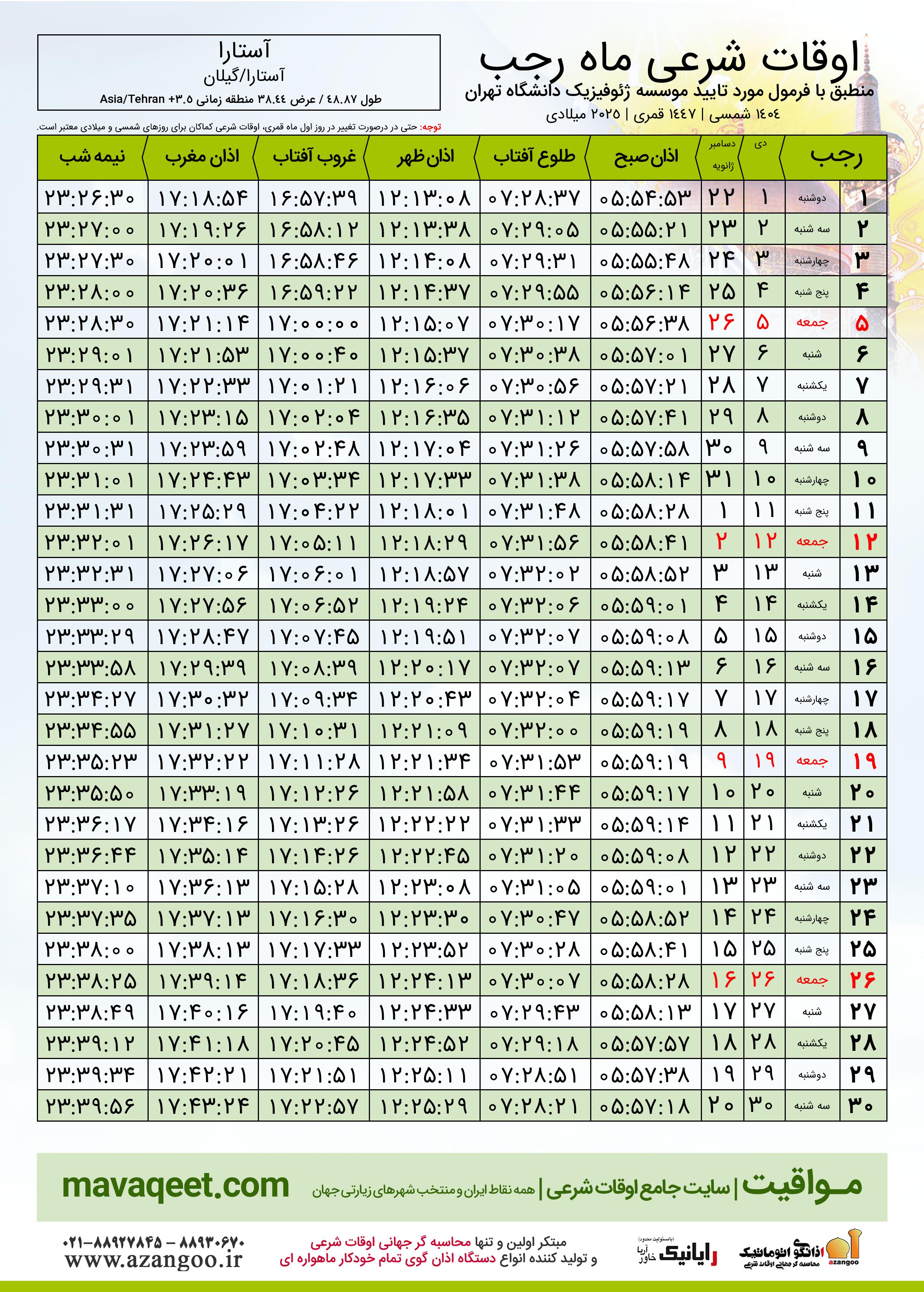 جهت نمایش تصویر جدول اوقات شرعی ماه رجب ١٤٤٧ هـ.ق شهر آستارا در اندازه