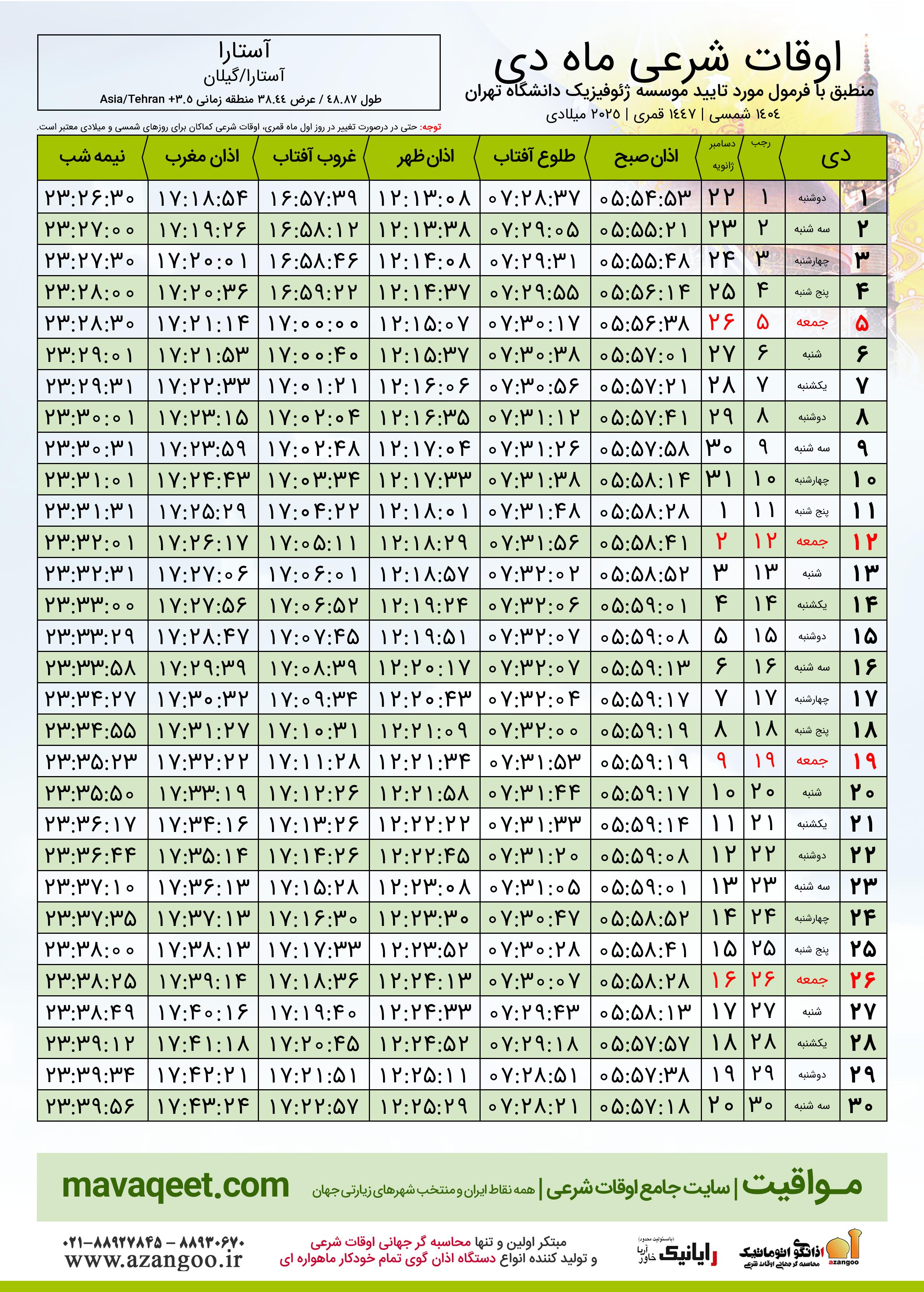 اوقات شرعی دی ١٤٠٤ شمسی شهر آستارا