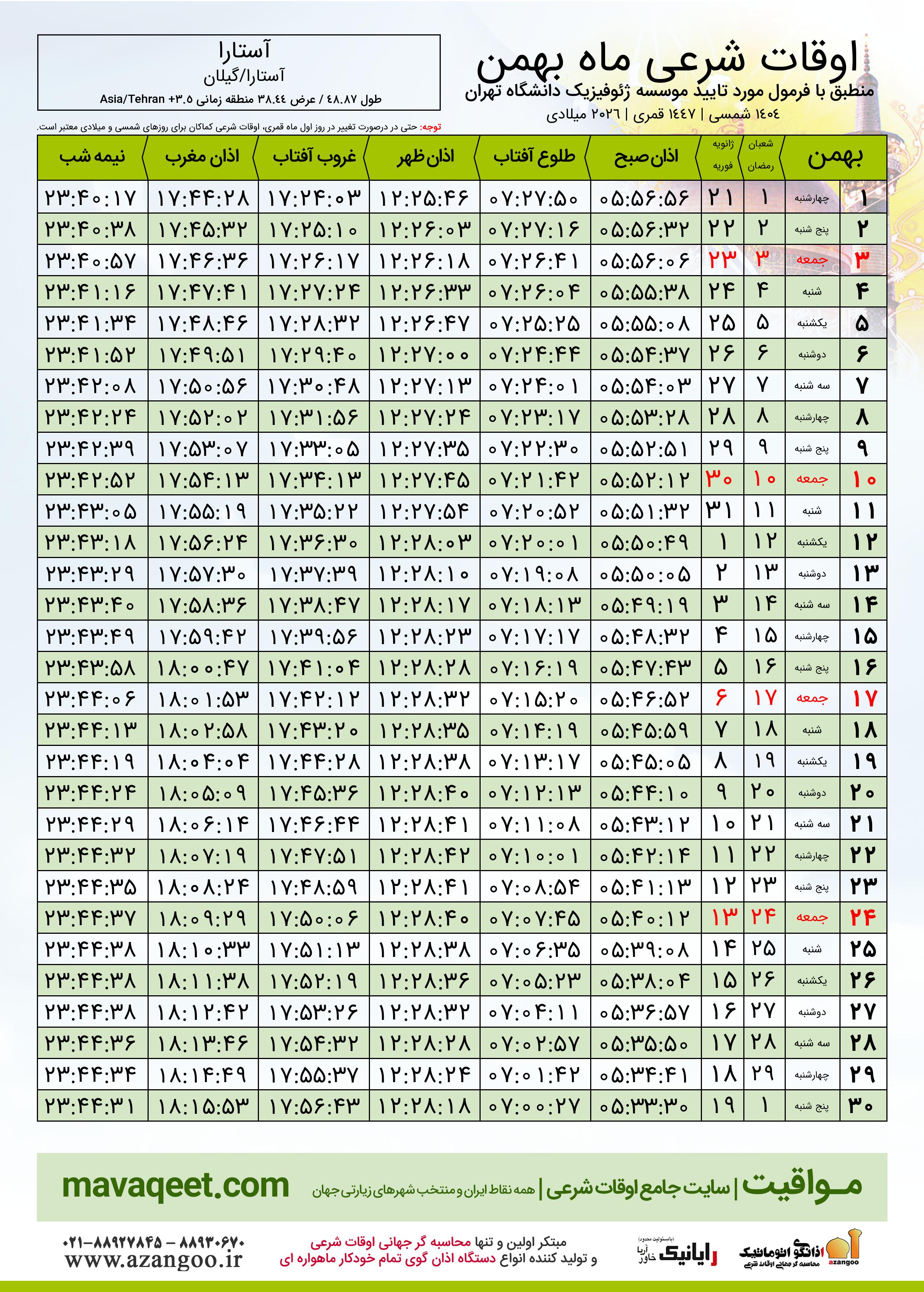 دانلود اوقات شرعی بهمن ٠٤ - ١٤٠٤ شهر آستارا